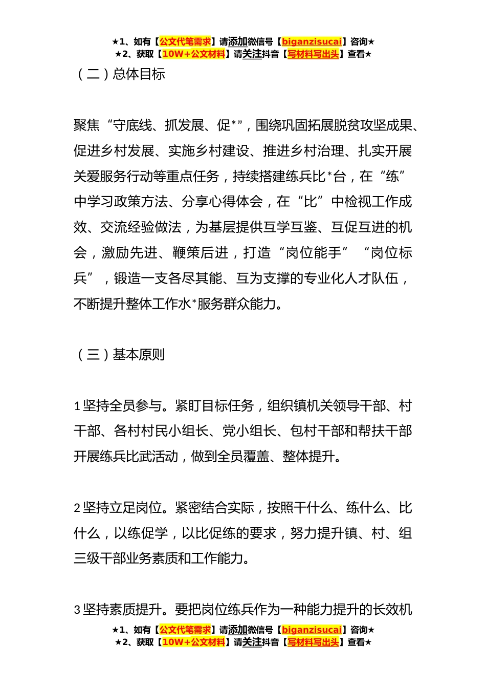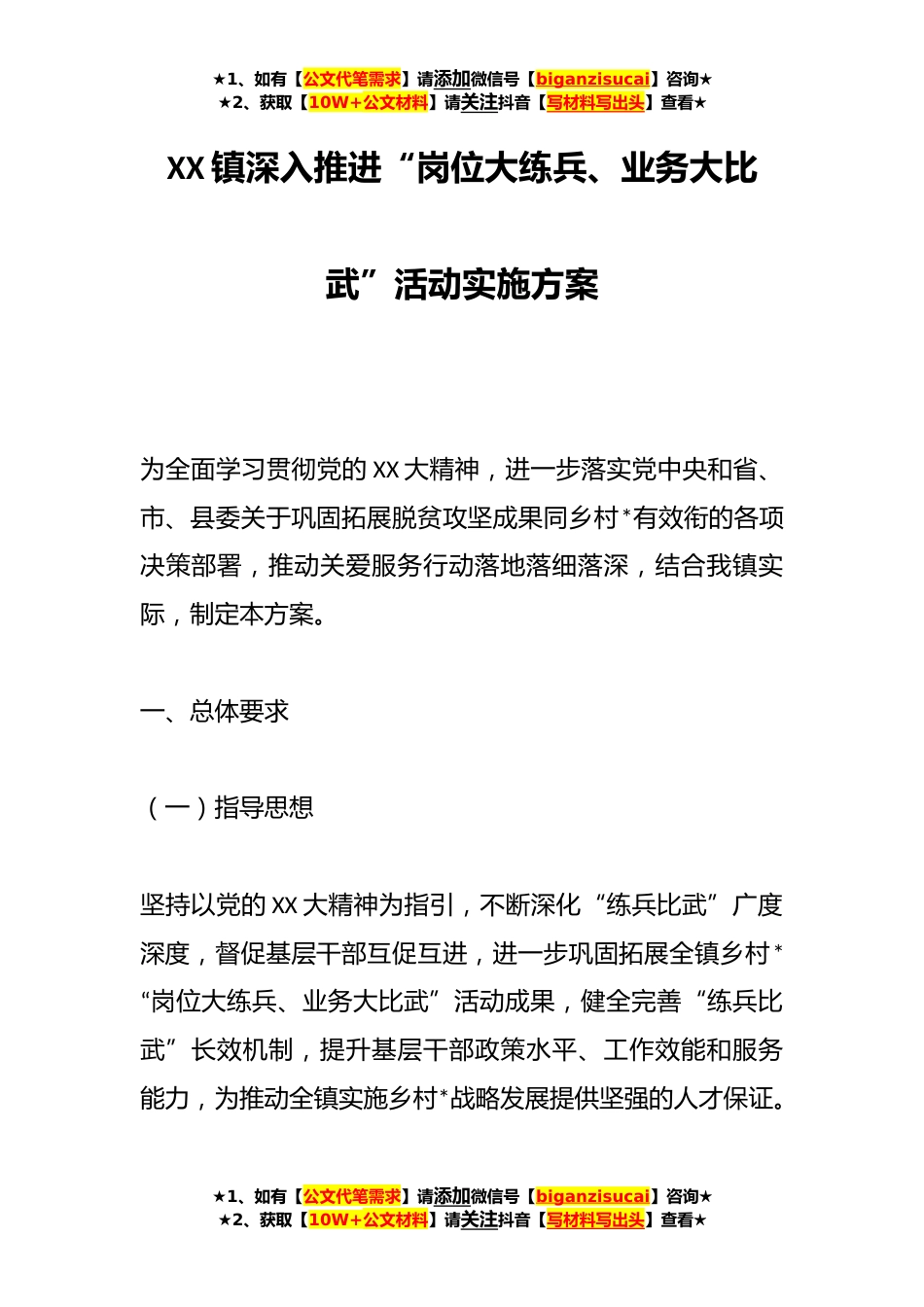 ★1、如有【公文代笔需求】请添加微信号【biganzisucai】咨询★★2、获取【10W+公文材料】请关注抖音【写材料写出头】查看★XX镇深入推进“岗位大练兵、业务大比武”活动实施方案为全面学习贯彻党的XX大精神,进一步落实党中央和省、市、县委关于巩固拓展脱贫攻坚成果同乡村*有效衔的各项决策部署,推动关爱服务行动落地落细落深,结合我镇实际,制定本方案。一、总体要求(一)指导思想坚持以党的XX大精神为指引,不断深化“练兵比武”广度深度,督促基层干部互促互进,进一步巩固拓展全镇乡村*“岗位大练兵、业务大比武”活动成果,健全完善“练兵比武”长效机制,提升基层干部政策水平、工作效能和服务能力,为推动全镇实施乡村*战略发展提供坚强的人才保证。★1、如有【公文代笔需求】请添加微信号【biganzisu...