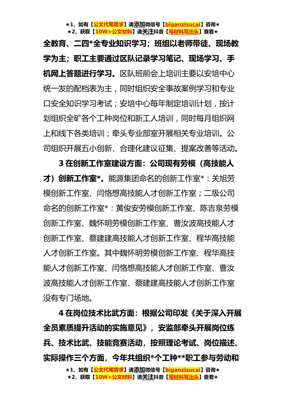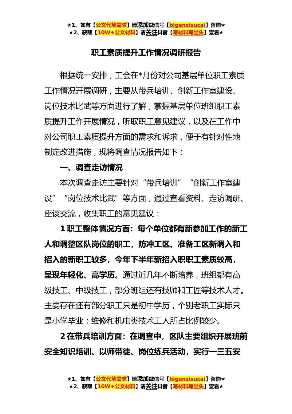 ★1、如有【公文代笔需求】请添加微信号【biganzisucai】咨询★★2、获取【10W+公文材料】请关注抖音【写材料写出头】查看★职工素质提升工作情况调研报告根据统一安排,工会在*月份对公司基层单位职工素质工作情况开展调研,主要从带兵培训、创新工作室建设、岗位技术比武等方面进行了解,掌握基层单位班组职工素质提升工作开展情况,听取职工意见建议,以及在工作中对公司职工素质提升方面的需求和诉求,便于有针对性地制定改进措施,现将调查情况报告如下:一、调查走访情况本次调查走访主要针对“带兵培训”“创新工作室建设”“岗位技术比武”等方面,通过查看资料、走访调研、座谈交流,收集职工的意见建议:1职工整体情况方面:每个单位都有新参加工作的新工人和调整区队岗位的职工,防冲工区、准备工区新...