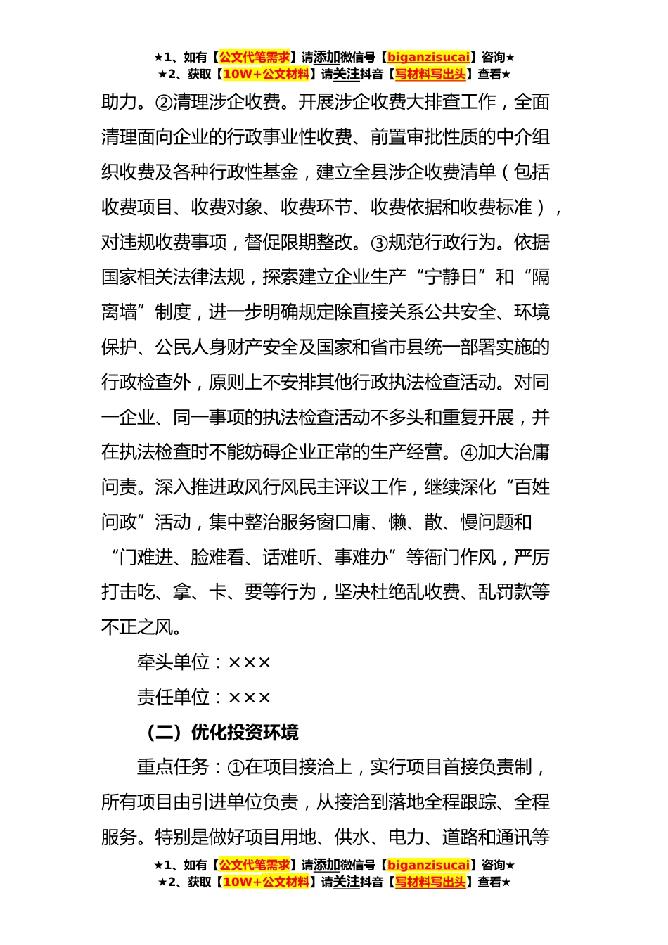 ★1、如有【公文代笔需求】请添加微信号【biganzisucai】咨询★★2、获取【10W+公文材料】请关注抖音【写材料写出头】查看★XXX优化经济发展环境活动实施方案为了切实解决全县经济发展中的突出问题,提升服务质量和水平,不断扩大招商引资成果,促进县域经济平稳健康发展,县委、县政府决定在全县范围内开展优化经济发展环境活动。现结合县情实际,特制定本方案。一、指导思想深入贯彻党的XX大精神,以“环境大提升、企业得实惠、发展提速度”为目标,集中开展以“解难、减负、融资、增效”为重点的优化经济发展环境活动,不断优化企业发展的服务环境、投资环境、法治环境、融资环境和人文环境,着力营造重商、亲商、安商和富商的浓厚氛围,为全县经济健*稳发展提供有力保障。二、重点任务及责任分工(一)优化服...