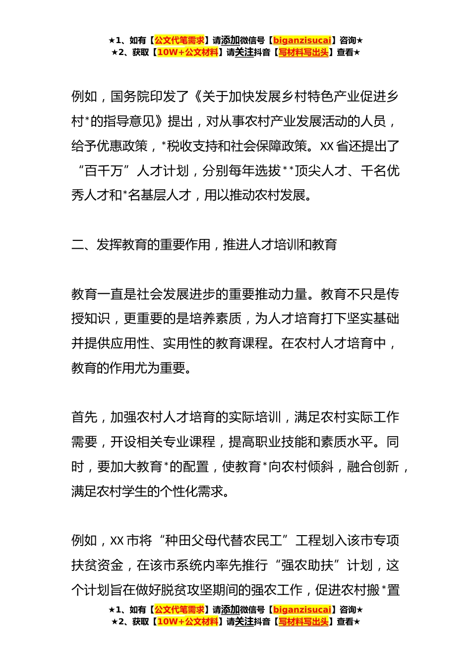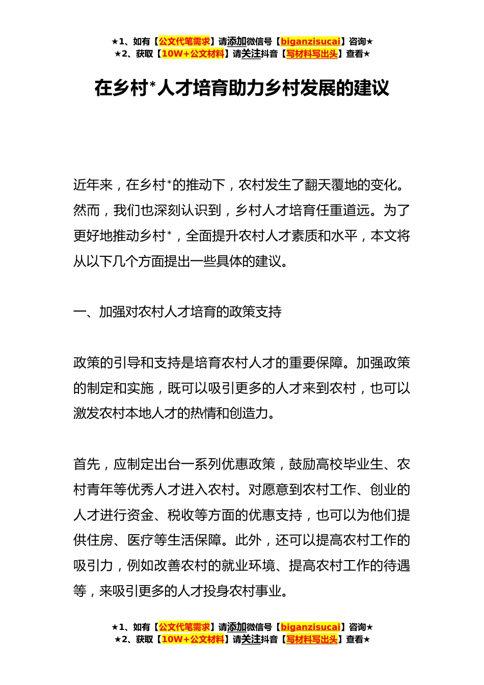 ★1、如有【公文代笔需求】请添加微信号【biganzisucai】咨询★★2、获取【10W+公文材料】请关注抖音【写材料写出头】查看★在乡村*人才培育助力乡村发展的建议近年来,在乡村*的推动下,农村发生了翻天覆地的变化。然而,我们也深刻认识到,乡村人才培育任重道远。为了更好地推动乡村*,全面提升农村人才素质和水平,本文将从以下几个方面提出一些具体的建议。一、加强对农村人才培育的政策支持政策的引导和支持是培育农村人才的重要保障。加强政策的制定和实施,既可以吸引更多的人才来到农村,也可以激发农村本地人才的热情和创造力。首先,应制定出台一系列优惠政策,鼓励高校毕业生、农村青年等优秀人才进入农村。对愿意到农村工作、创业的人才进行资金、税收等方面的优惠支持,也可以为他们提供住房、医疗等...