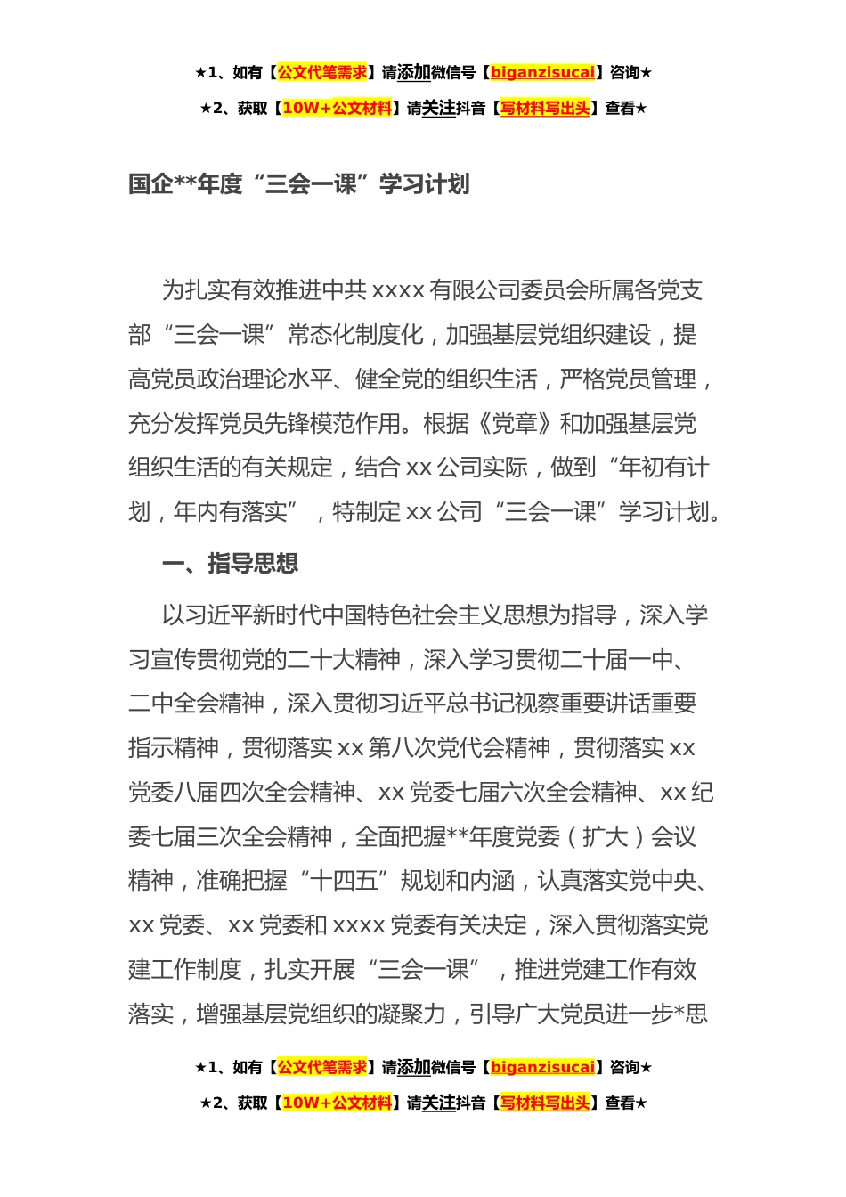 ★1、如有【公文代笔需求】请添加微信号【biganzisucai】咨询★★2、获取【10W+公文材料】请关注抖音【写材料写出头】查看★国企**年度“三会一课”学习计划为扎实有效推进中共xxxx有限公司委员会所属各党支部“三会一课”常态化制度化,加强基层党组织建设,提高党员政治理论水平、健全党的组织生活,严格党员管理,充分发挥党员先锋模范作用。根据《党章》和加强基层党组织生活的有关规定,结合xx公司实际,做到“年初有计划,年内有落实”,特制定xx公司“三会一课”学习计划。一、指导思想以习近平新时代中国特色社会主义思想为指导,深入学习宣传贯彻党的二十大精神,深入学习贯彻二十届一中、二中全会精神,深入贯彻习近平总书记视察重要讲话重要指示精神,贯彻落实xx第八次党代会精神,贯彻落实xx党委八届...