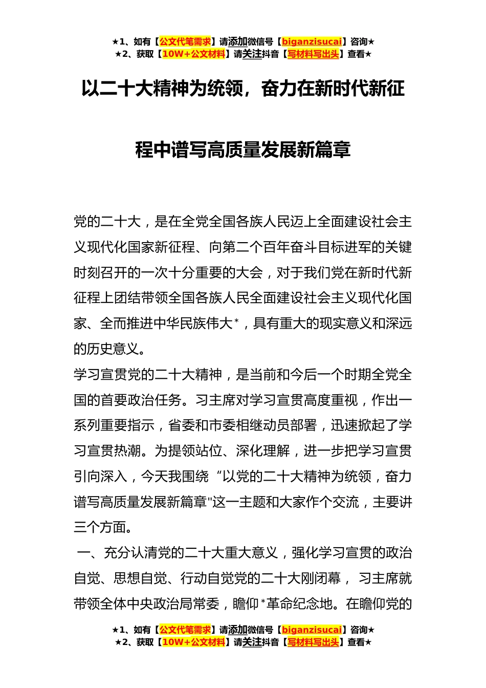★1、如有【公文代笔需求】请添加微信号【biganzisucai】咨询★★2、获取【10W+公文材料】请关注抖音【写材料写出头】查看★以二十大精神为统领,奋力在新时代新征程中谱写高质量发展新篇章党的二十大,是在全党全国各族人民迈上全面建设社会主义现代化国家新征程、向第二个百年奋斗目标进军的关键时刻召开的一次十分重要的大会,对于我们党在新时代新征程上团结带领全国各族人民全面建设社会主义现代化国家、全而推进中华民族伟大*,具有重大的现实意义和深远的历史意义。学习宣贯党的二十大精神,是当前和今后一个时期全党全国的首要政治任务。习主席对学习宣贯高度重视,作出一系列重要指示,省委和市委相继动员部署,迅速掀起了学习宣贯热潮。为提领站位、深化理解,进一步把学习宣贯引向深入,今天我围绕“以...