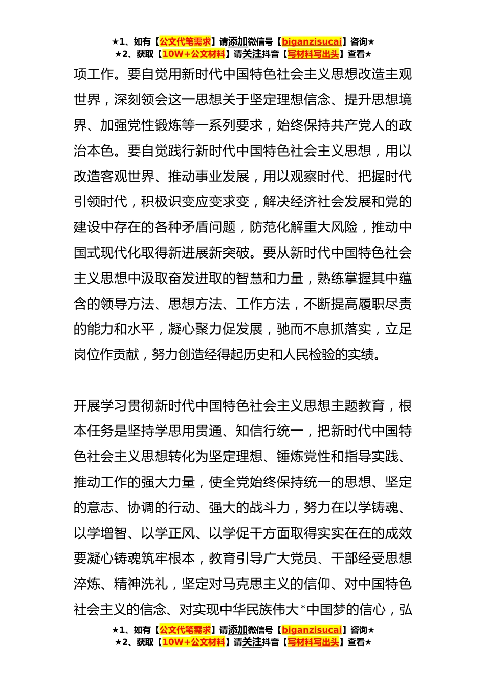 ★1、如有【公文代笔需求】请添加微信号【biganzisucai】咨询★★2、获取【10W+公文材料】请关注抖音【写材料写出头】查看★**年某市体育局党组开展主题教育的实施方案根据《中共中央关于在全党开展开展学习贯彻习近平新时代中国特色社会主义思想主题教育的意见》精神,结合群众体育工作实际,就开展开展学习贯彻习近平新时代中国特色社会主义思想主题教育,作出如下安排。一、把握总体要求主题教育要牢牢把握“学思想、强党性、重实践、建新功”的总要求。要全面学习领会新时代中国特色社会主义思想,全面系统掌握这一思想的基本观点、科学体系,把握好这一思想的世界观、方法论,坚持好、运用好贯穿其中的立场观点方法,不断增进对党的创新理论的政治认同思想认同、理论认同、情感认同,真正把马克思主义看家本...