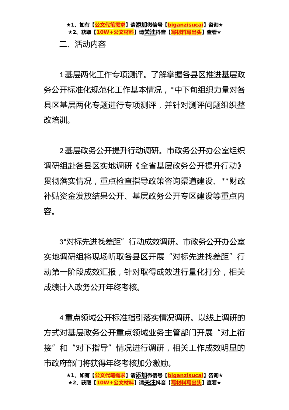 ★1、如有【公文代笔需求】请添加微信号【biganzisucai】咨询★★2、获取【10W+公文材料】请关注抖音【写材料写出头】查看★关于基层政务公开“大调研大推动大提升”活动实施方案为在全市政务公开系统*调查研究之风,持续深化“一改两为”,扎实推进我市基层政务公开各项工作落地落实以新气象新担当新作为推动新发展,市政务公开办公室决定在全市组织开展**年基层政务公开“大调研大推动大提升”活动。现将有关事项通知如下:一、活动目的深入贯彻落实国务院办公厅和省政务公开办公室关于推动基层政务公开工作相关决策部署,以深入调查研究掌握实情为突破口,全面梳理当前我市基层政务公开基本情况和工作推动过程中遇到的困难问题,坚持“问题导向、标准引领、高位推动、稳步提升”总体思路,补齐我市县区基层政务...