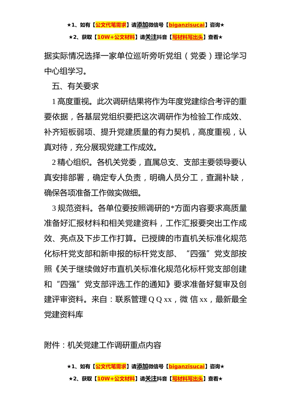★1、如有【公文代笔需求】请添加微信号【biganzisucai】咨询★★2、获取【10W+公文材料】请关注抖音【写材料写出头】查看★机关党建工作调研为贯彻落实全市机关党建工作会议精神,全面检视X年度市直机关党建工作开展情况,总结经验做法,推动学习交流,提升市直机关党建工作质量,根据年度党建工作计划安排,拟定于X年*月开始,开展X年度市直机关党建工作调研,现将有关事宜通知如下:一、调研时间X年*月至*月二、调研对象市直及驻周各单位机关党委,直属总支、支部。三、调研方式主要采取听取汇报、实地察看、座谈交流、查阅资料等方式,对各单位年度党建工作情况进行全面了解。四、调研内容重点围绕模范机关创建开展调研,主要内容包括政治建设、组织建设、作风和纪律建设、服务中心大局等*方面,具体内容要求...
