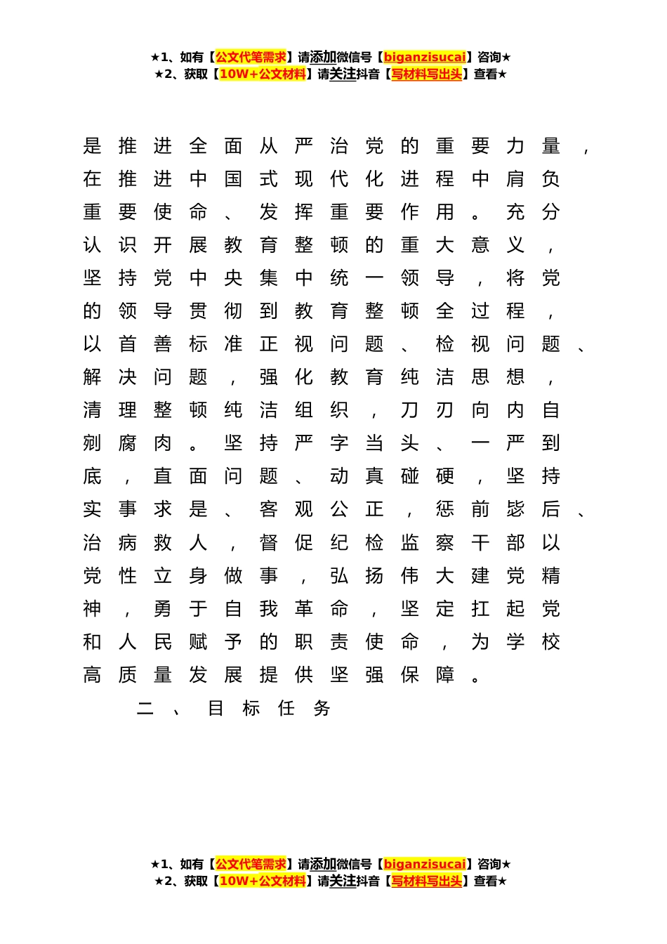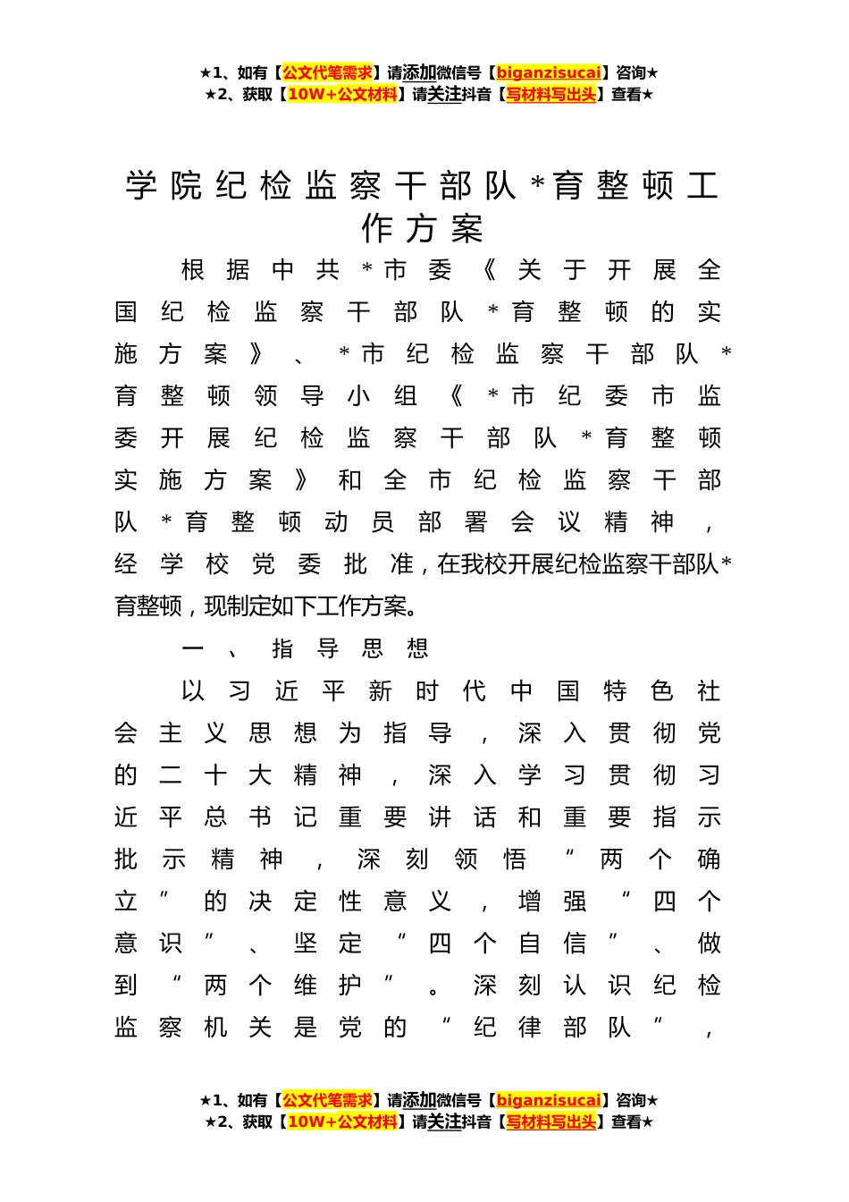 ★1、如有【公文代笔需求】请添加微信号【biganzisucai】咨询★★2、获取【10W+公文材料】请关注抖音【写材料写出头】查看★学院纪检监察干部队*育整顿工作方案根据中共*市委《关于开展全国纪检监察干部队*育整顿的实施方案》、*市纪检监察干部队*育整顿领导小组《*市纪委市监委开展纪检监察干部队*育整顿实施方案》和全市纪检监察干部队*育整顿动员部署会议精神,经学校党委批准,在我校开展纪检监察干部队*育整顿,现制定如下工作方案。一、指导思想以习近平新时代中国特色社会主义思想为指导,深入贯彻党的二十大精神,深入学习贯彻习近平总书记重要讲话和重要指示批示精神,深刻领悟“两个确立”的决定性意义,增强“四个意识”、坚定“四个自信”、做到“两个维护”。深刻认识纪检监察机关是党的“纪律部队”...