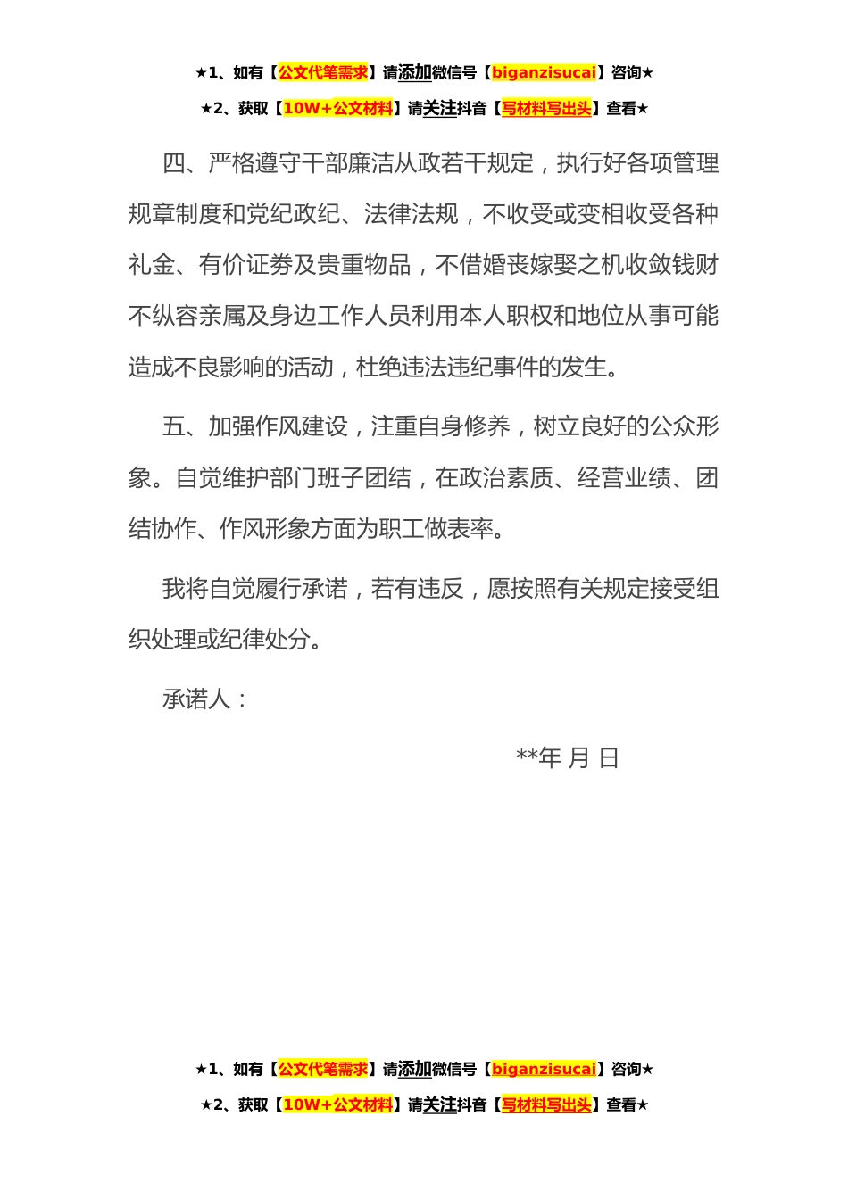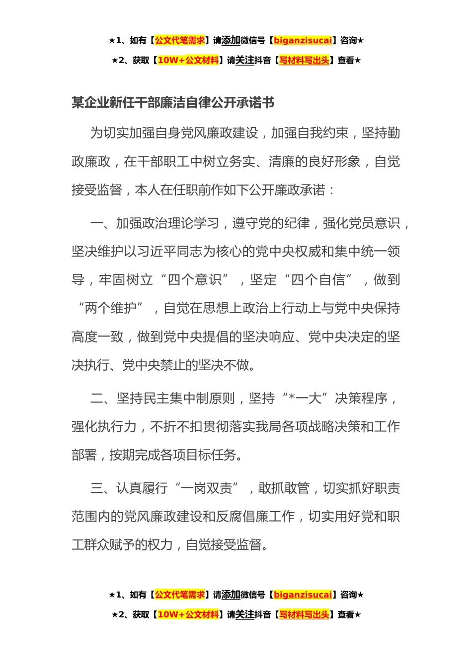 ★1、如有【公文代笔需求】请添加微信号【biganzisucai】咨询★★2、获取【10W+公文材料】请关注抖音【写材料写出头】查看★某企业新任干部廉洁自律公开承诺书为切实加强自身党风廉政建设,加强自我约束,坚持勤政廉政,在干部职工中树立务实、清廉的良好形象,自觉接受监督,本人在任职前作如下公开廉政承诺:一、加强政治理论学习,遵守党的纪律,强化党员意识,坚决维护以习近平同志为核心的党中央权威和集中统一领导,牢固树立“四个意识”,坚定“四个自信”,做到“两个维护”,自觉在思想上政治上行动上与党中央保持高度一致,做到党中央提倡的坚决响应、党中央决定的坚决执行、党中央禁止的坚决不做。二、坚持民主集中制原则,坚持“*一大”决策程序,强化执行力,不折不扣贯彻落实我局各项战略决策和工作...