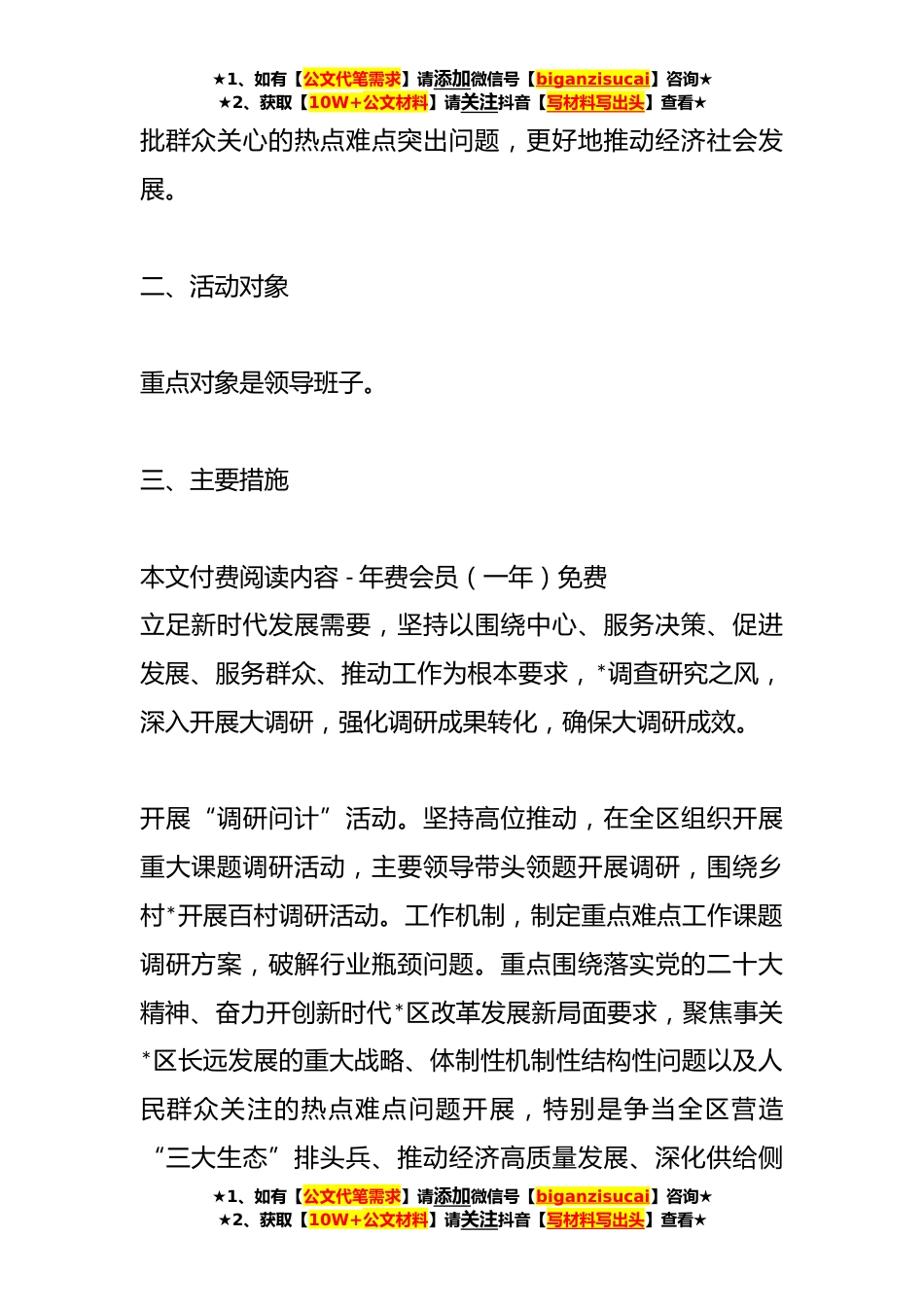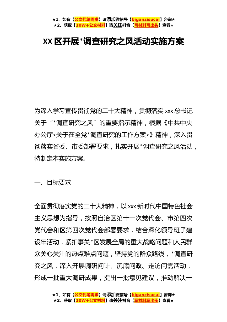 ★1、如有【公文代笔需求】请添加微信号【biganzisucai】咨询★★2、获取【10W+公文材料】请关注抖音【写材料写出头】查看★XX区开展*调查研究之风活动实施方案为深入学习宣传贯彻党的二十大精神,贯彻落实xxx总书记关于“*调查研究之风”的重要指示精神,根据《中共中央办公厅<关于在全党*调查研究的工作方案>》精神,深入贯彻落实省委、市委部署要求,扎实开展*调查研究之风活动,特制定本实施方案。一、目标要求全面贯彻落实党的二十大精神,以xxx新时代中国特色社会主义思想为指导,按照自治区第十一次党代会、市第四次党代会和区第四次党代会部署要求,结合深化领导班子建设年活动,紧扣事关*区发展全局的重大战略问题和人民群众关心关注的热点难点问题,坚持党的群众路线,*调查研究之风,深入开展调研问计...