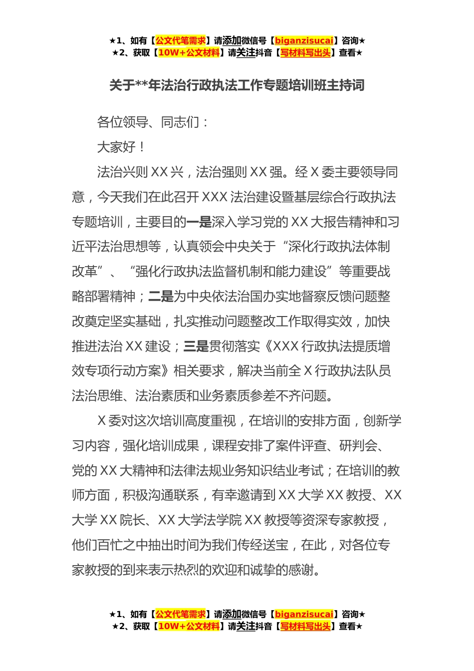 ★1、如有【公文代笔需求】请添加微信号【biganzisucai】咨询★★2、获取【10W+公文材料】请关注抖音【写材料写出头】查看★关于**年法治行政执法工作专题培训班主持词各位领导、同志们:大家好!法治兴则XX兴,法治强则XX强。经X委主要领导同意,今天我们在此召开XXX法治建设暨基层综合行政执法专题培训,主要目的一是深入学习党的XX大报告精神和习近平法治思想等,认真领会中央关于“深化行政执法体制改革”、“强化行政执法监督机制和能力建设”等重要战略部署精神;二是为中央依法治国办实地督察反馈问题整改奠定坚实基础,扎实推动问题整改工作取得实效,加快推进法治XX建设;三是贯彻落实《XXX行政执法提质增效专项行动方案》相关要求,解决当前全X行政执法队员法治思维、法治素质和业务素质参差不齐问题。X...
