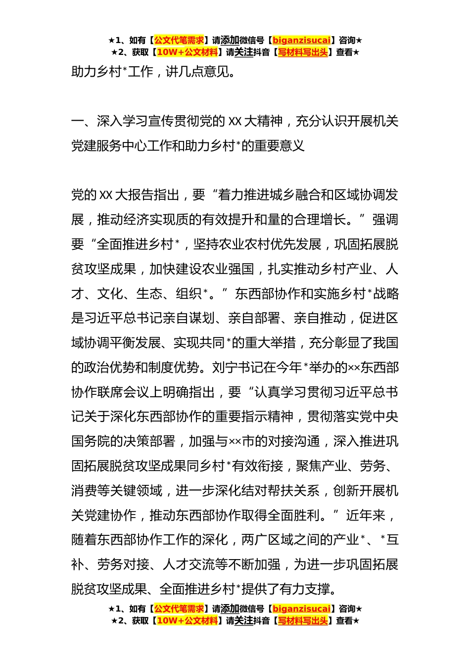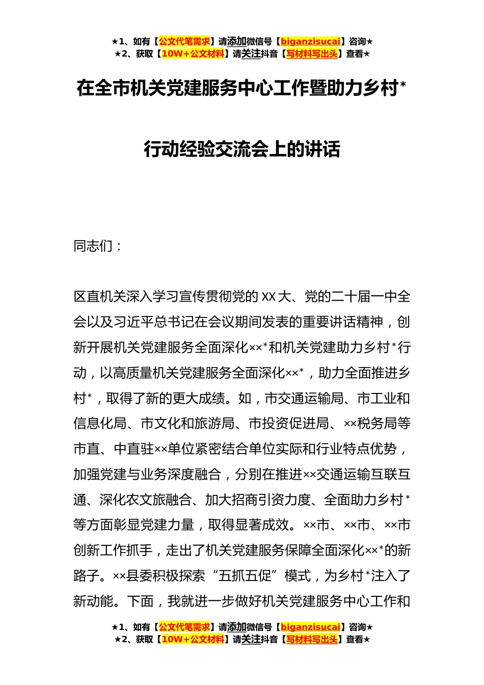 ★1、如有【公文代笔需求】请添加微信号【biganzisucai】咨询★★2、获取【10W+公文材料】请关注抖音【写材料写出头】查看★在全市机关党建服务中心工作暨助力乡村*行动经验交流会上的讲话同志们:区直机关深入学习宣传贯彻党的XX大、党的二十届一中全会以及习近平总书记在会议期间发表的重要讲话精神,创新开展机关党建服务全面深化××*和机关党建助力乡村*行动,以高质量机关党建服务全面深化××*,助力全面推进乡村*,取得了新的更大成绩。如,市交通运输局、市工业和信息化局、市文化和旅游局、市投资促进局、××税务局等市直、中直驻××单位紧密结合单位实际和行业特点优势,加强党建与业务深度融合,分别在推进××交通运输互联互通、深化农文旅融合、加大招商引资力度、全面助力乡村*等方面彰显党建力...