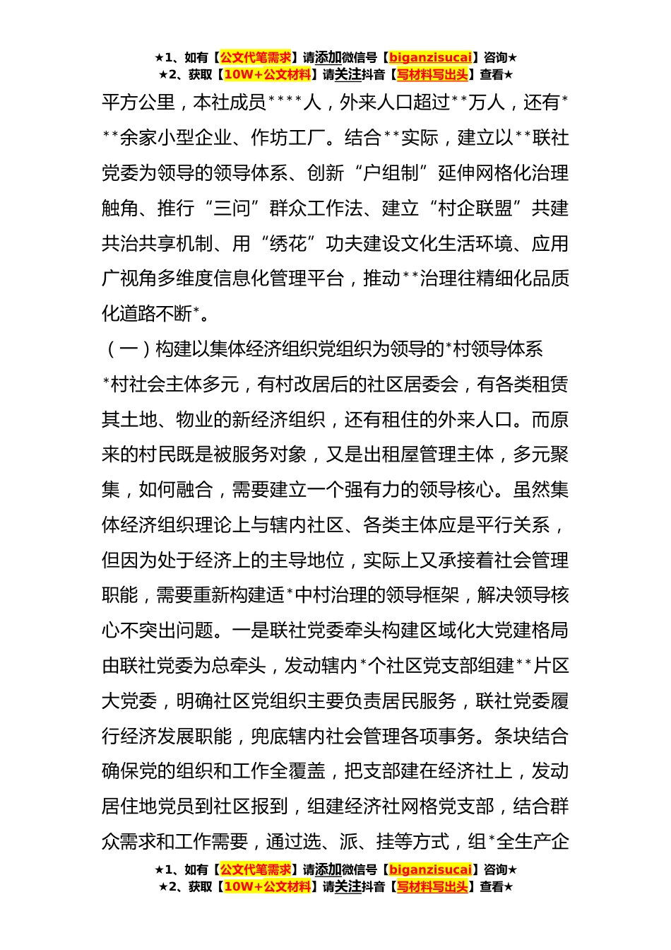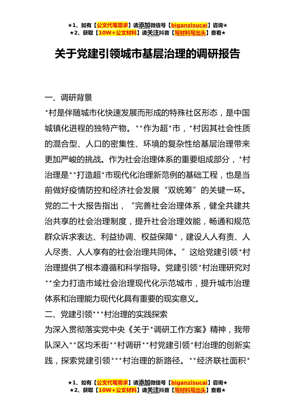 ★1、如有【公文代笔需求】请添加微信号【biganzisucai】咨询★★2、获取【10W+公文材料】请关注抖音【写材料写出头】查看★关于党建引领城市基层治理的调研报告一、调研背景*村是伴随城市化快速发展而形成的特殊社区形态,是中国城镇化进程的独特产物。**作为超*市,*村因其社会性质的混合型、人口的密集性、环境的复杂性给基层治理带来更加严峻的挑战。作为社会治理体系的重要组成部分,*村治理是**打造超*市现代化治理新范例的基础工程,也是当前做好疫情防控和经济社会发展“双统筹”的关键一环。党的二十大报告指出,“完善社会治理体系,健全共建共治共享的社会治理制度,提升社会治理效能,畅通和规范群众诉求表达、利益协调、权益保障*,建设人人有责、人人尽责、人人享有的社会治理共同体。”这给党建引...