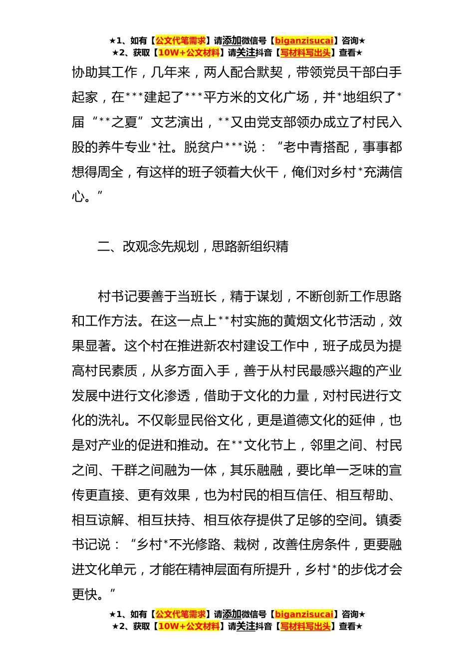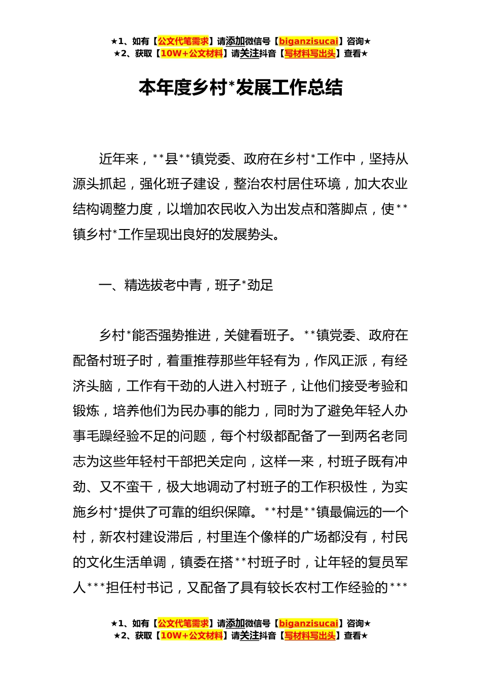 ★1、如有【公文代笔需求】请添加微信号【biganzisucai】咨询★★2、获取【10W+公文材料】请关注抖音【写材料写出头】查看★本年度乡村*发展工作总结近年来,**县**镇党委、政府在乡村*工作中,坚持从源头抓起,强化班子建设,整治农村居住环境,加大农业结构调整力度,以增加农民收入为出发点和落脚点,使**镇乡村*工作呈现出良好的发展势头。一、精选拔老中青,班子*劲足乡村*能否强势推进,关健看班子。**镇党委、政府在配备村班子时,着重推荐那些年轻有为,作风正派,有经济头脑,工作有干劲的人进入村班子,让他们接受考验和锻炼,培养他们为民办事的能力,同时为了避免年轻人办事毛躁经验不足的问题,每个村级都配备了一到两名老同志为这些年轻村干部把关定向,这样一来,村班子既有冲劲、又不蛮干,极大地...