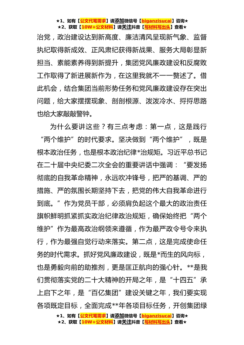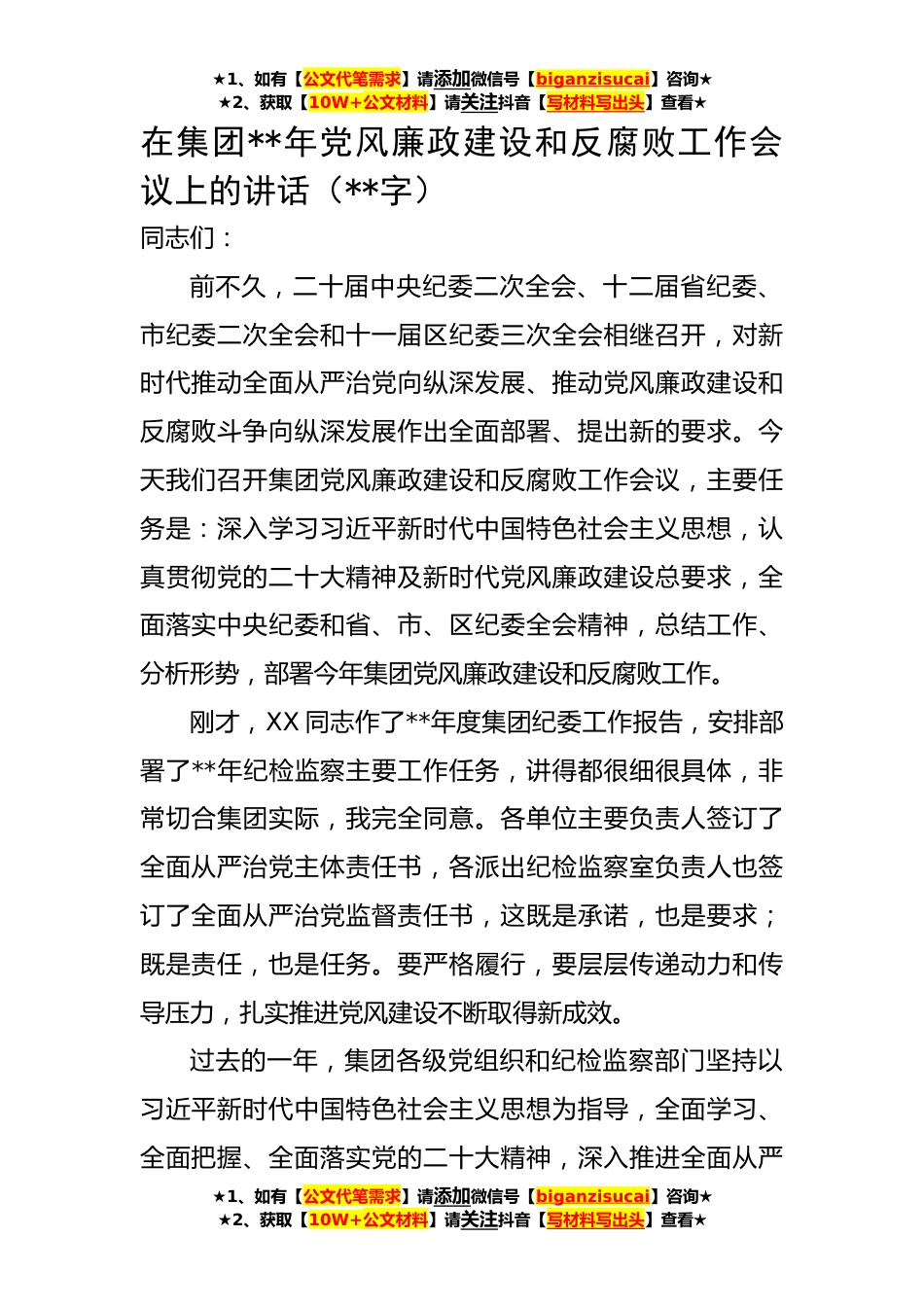★1、如有【公文代笔需求】请添加微信号【biganzisucai】咨询★★2、获取【10W+公文材料】请关注抖音【写材料写出头】查看★在集团**年党风廉政建设和反腐败工作会议上的讲话(**字)同志们:前不久,二十届中央纪委二次全会、十二届省纪委、市纪委二次全会和十一届区纪委三次全会相继召开,对新时代推动全面从严治党向纵深发展、推动党风廉政建设和反腐败斗争向纵深发展作出全面部署、提出新的要求。今天我们召开集团党风廉政建设和反腐败工作会议,主要任务是:深入学习习近平新时代中国特色社会主义思想,认真贯彻党的二十大精神及新时代党风廉政建设总要求,全面落实中央纪委和省、市、区纪委全会精神,总结工作、分析形势,部署今年集团党风廉政建设和反腐败工作。刚才,XX同志作了**年度集团纪委工作报告,...