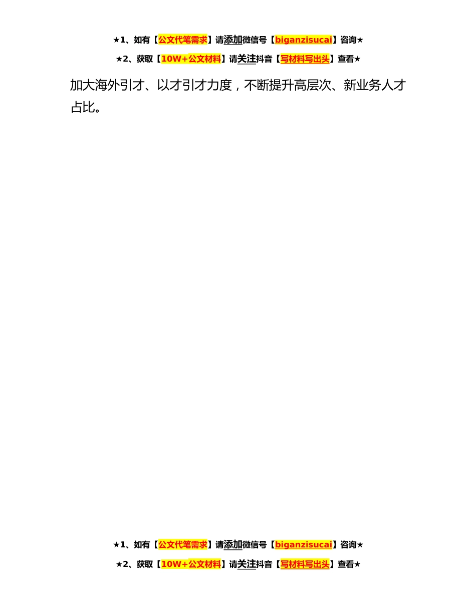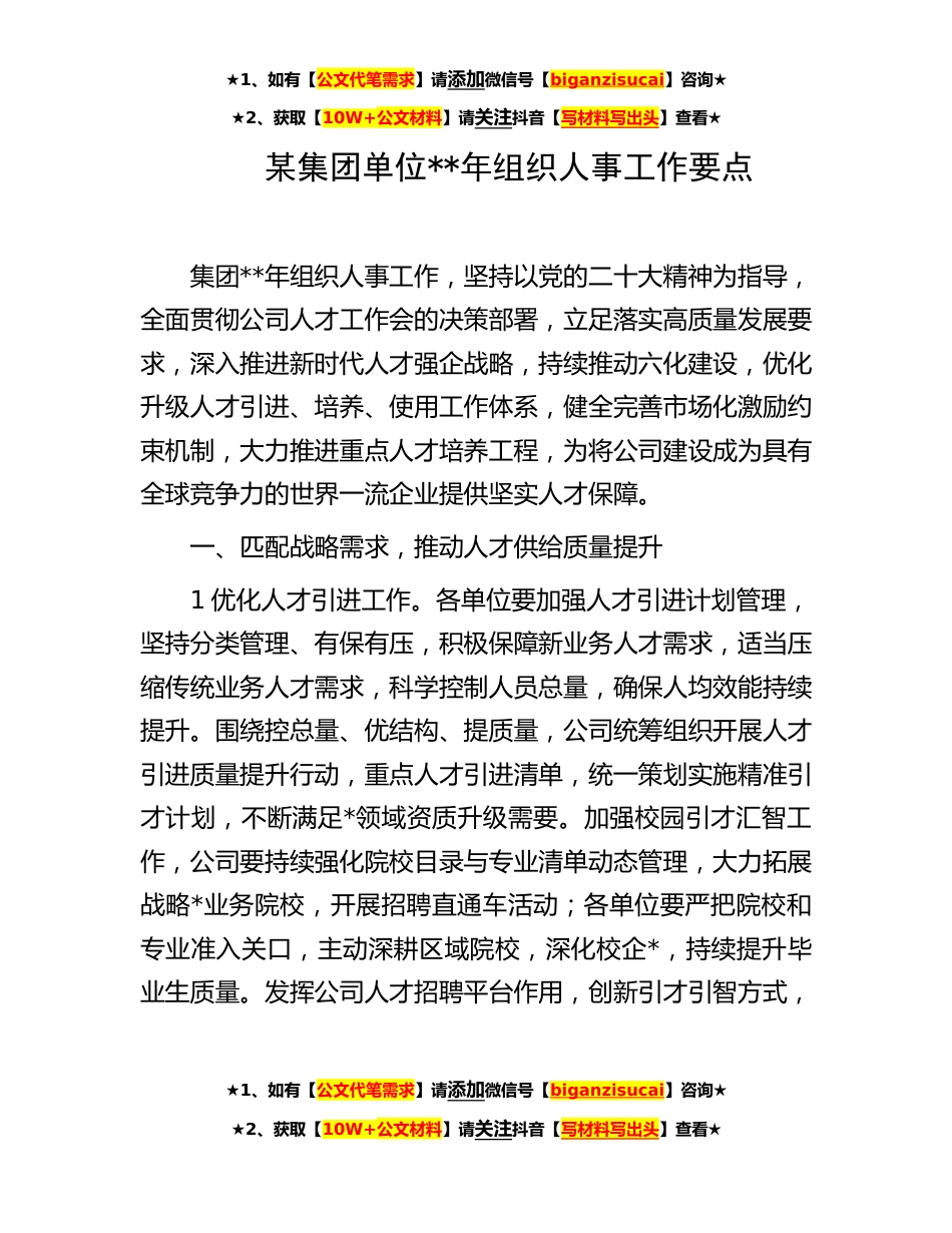 ★1、如有【公文代笔需求】请添加微信号【biganzisucai】咨询★★2、获取【10W+公文材料】请关注抖音【写材料写出头】查看★某集团单位**年组织人事工作要点集团**年组织人事工作,坚持以党的二十大精神为指导,全面贯彻公司人才工作会的决策部署,立足落实高质量发展要求,深入推进新时代人才强企战略,持续推动六化建设,优化升级人才引进、培养、使用工作体系,健全完善市场化激励约束机制,大力推进重点人才培养工程,为将公司建设成为具有全球竞争力的世界一流企业提供坚实人才保障。一、匹配战略需求,推动人才供给质量提升1优化人才引进工作。各单位要加强人才引进计划管理,坚持分类管理、有保有压,积极保障新业务人才需求,适当压缩传统业务人才需求,科学控制人员总量,确保人均效能持续提升。围绕控总...