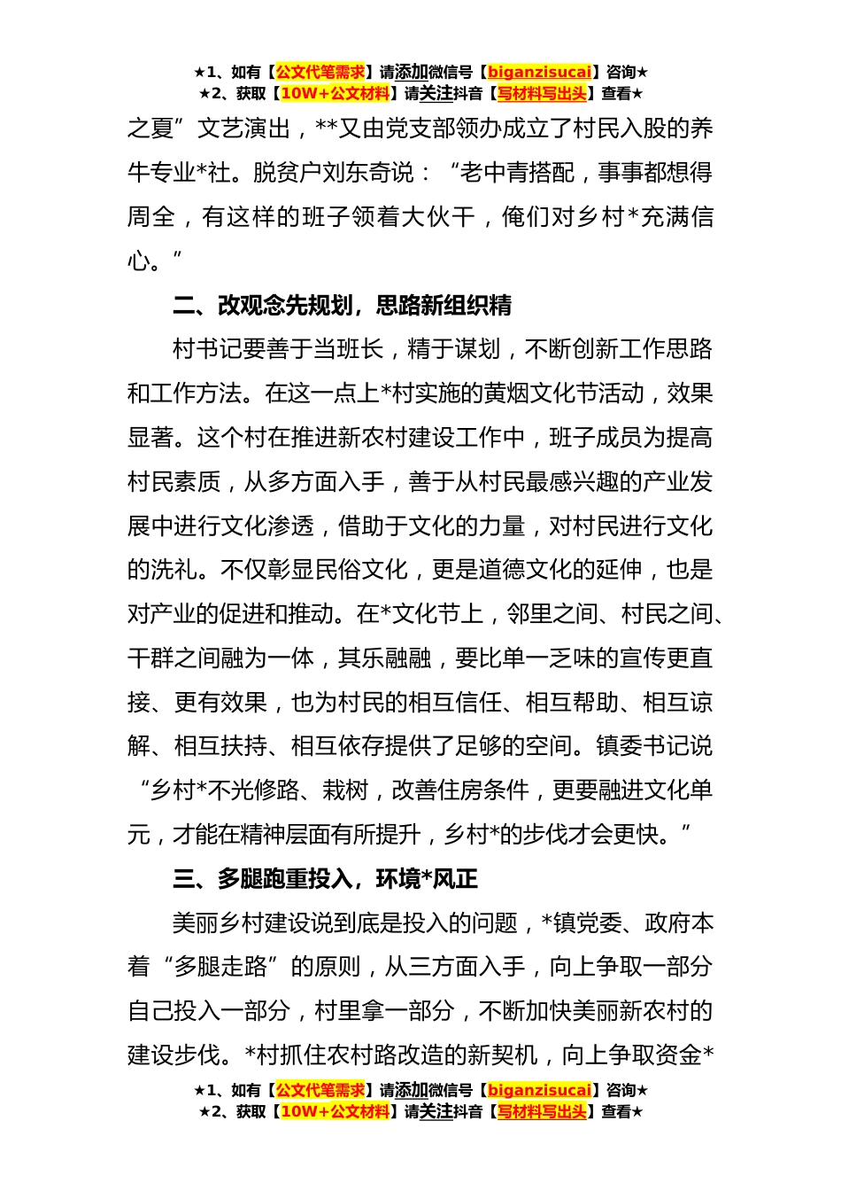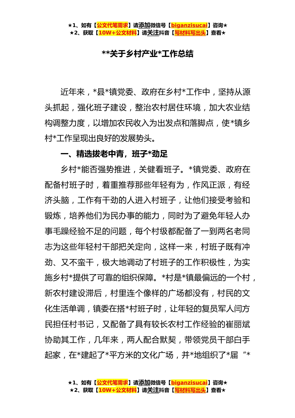 ★1、如有【公文代笔需求】请添加微信号【biganzisucai】咨询★★2、获取【10W+公文材料】请关注抖音【写材料写出头】查看★**关于乡村产业*工作总结近年来,*县*镇党委、政府在乡村*工作中,坚持从源头抓起,强化班子建设,整治农村居住环境,加大农业结构调整力度,以增加农民收入为出发点和落脚点,使*镇乡村*工作呈现出良好的发展势头。一、精选拔老中青,班子*劲足乡村*能否强势推进,关健看班子。*镇党委、政府在配备村班子时,着重推荐那些年轻有为,作风正派,有经济头脑,工作有干劲的人进入村班子,让他们接受考验和锻炼,培养他们为民办事的能力,同时为了避免年轻人办事毛躁经验不足的问题,每个村级都配备了一到两名老同志为这些年轻村干部把关定向,这样一来,村班子既有冲劲、又不蛮干,极大地调动...