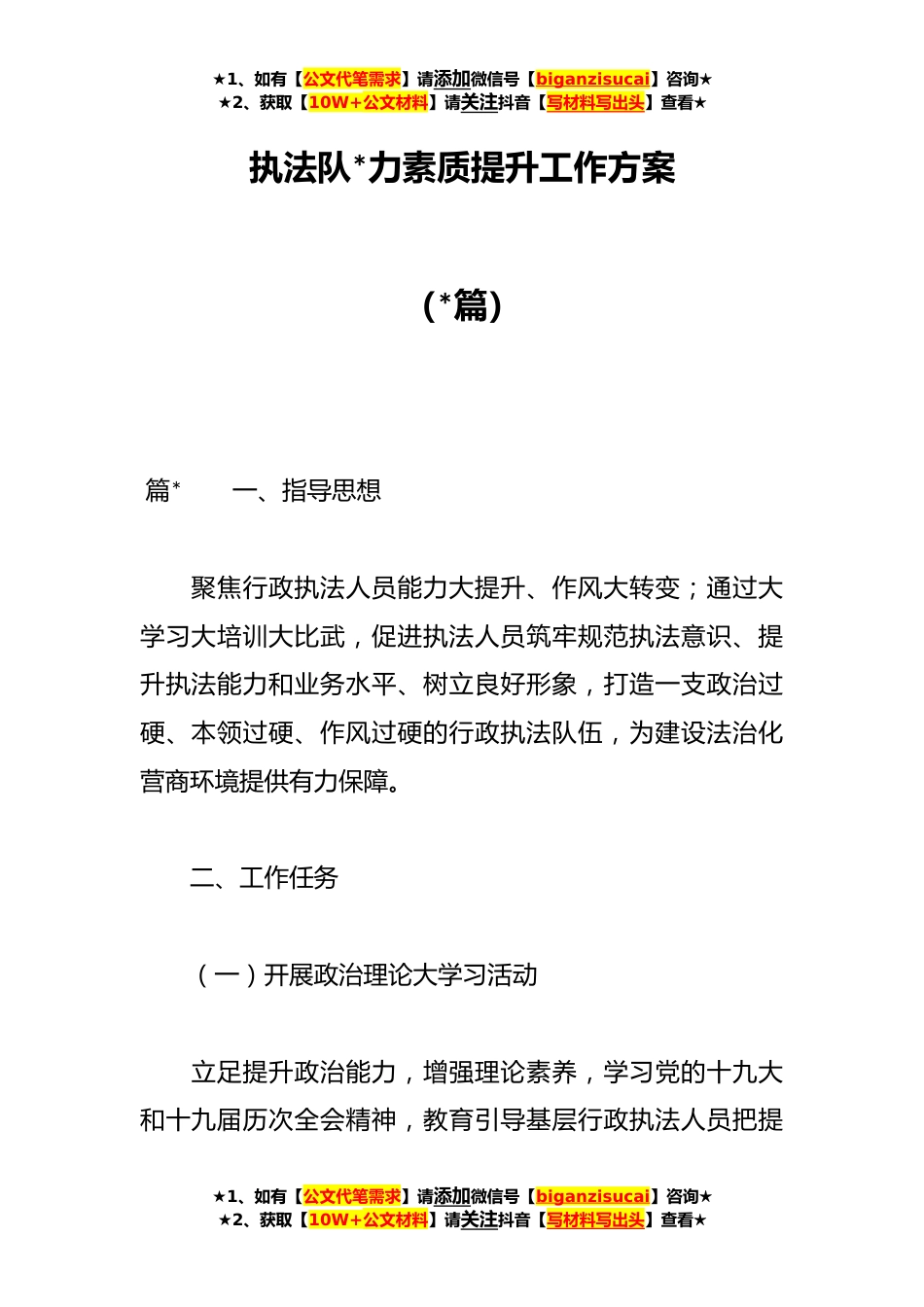 ★1、如有【公文代笔需求】请添加微信号【biganzisucai】咨询★★2、获取【10W+公文材料】请关注抖音【写材料写出头】查看★执法队*力素质提升工作方案(*篇)篇*一、指导思想聚焦行政执法人员能力大提升、作风大转变;通过大学习大培训大比武,促进执法人员筑牢规范执法意识、提升执法能力和业务水平、树立良好形象,打造一支政治过硬、本领过硬、作风过硬的行政执法队伍,为建设法治化营商环境提供有力保障。二、工作任务(一)开展政治理论大学习活动立足提升政治能力,增强理论素养,学习党的十九大和十九届历次全会精神,教育引导基层行政执法人员把提★1、如有【公文代笔需求】请添加微信号【biganzisucai】咨询★★2、获取【10W+公文材料】请关注抖音【写材料写出头】查看★★1、如有【公文代笔需求】请添...