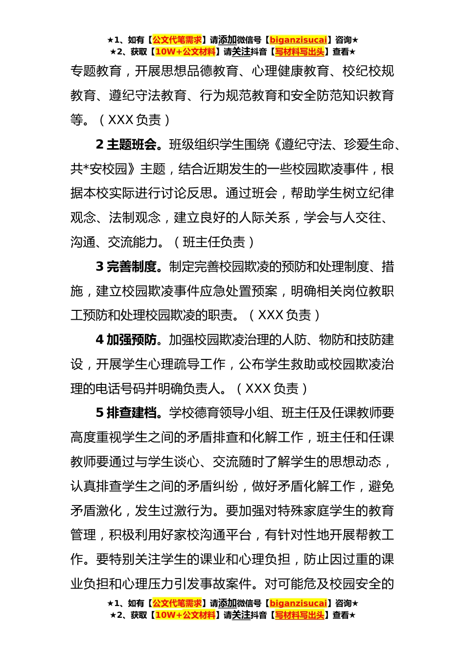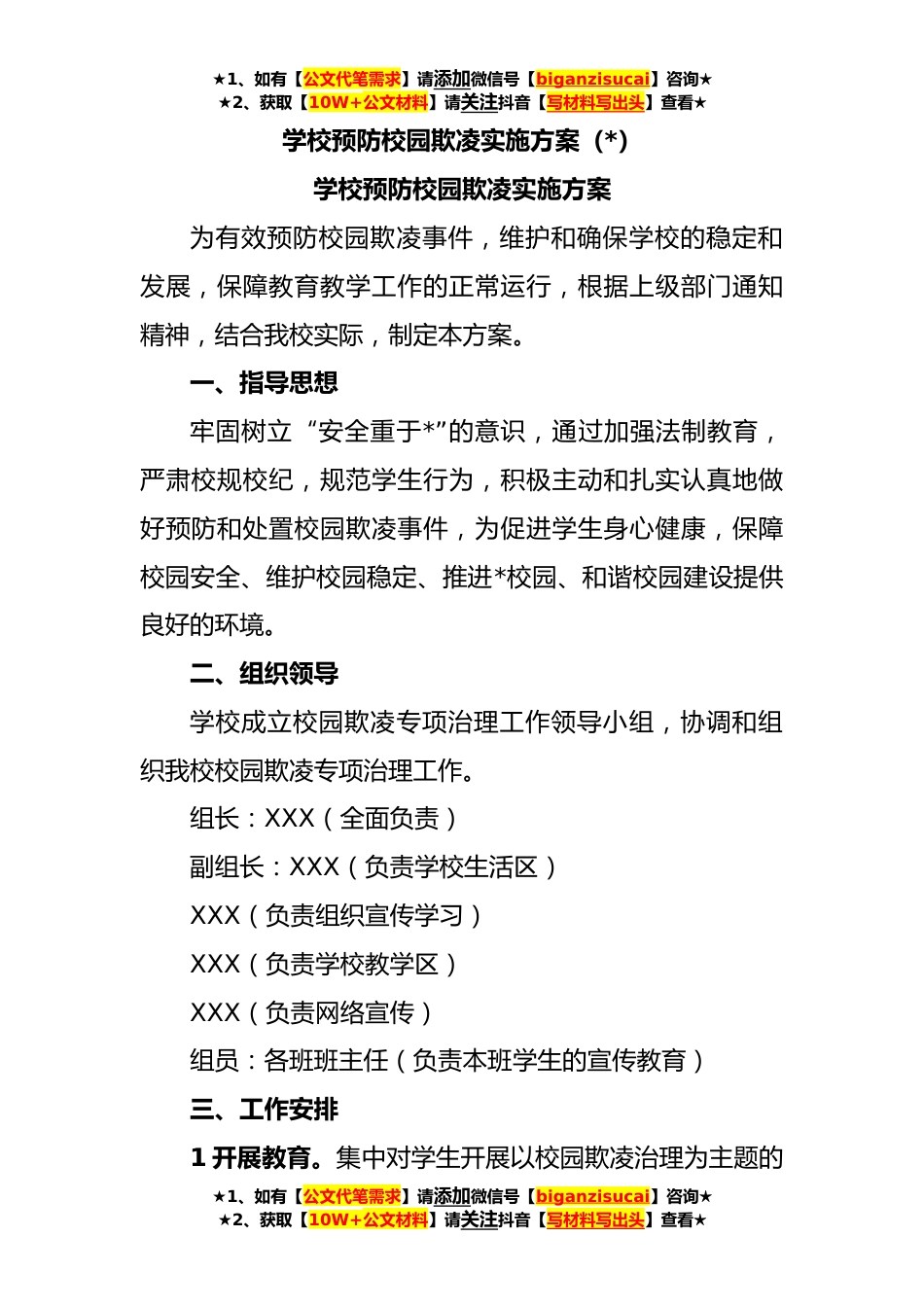 ★1、如有【公文代笔需求】请添加微信号【biganzisucai】咨询★★2、获取【10W+公文材料】请关注抖音【写材料写出头】查看★学校预防校园欺凌实施方案(*)学校预防校园欺凌实施方案为有效预防校园欺凌事件,维护和确保学校的稳定和发展,保障教育教学工作的正常运行,根据上级部门通知精神,结合我校实际,制定本方案。一、指导思想牢固树立“安全重于*”的意识,通过加强法制教育,严肃校规校纪,规范学生行为,积极主动和扎实认真地做好预防和处置校园欺凌事件,为促进学生身心健康,保障校园安全、维护校园稳定、推进*校园、和谐校园建设提供良好的环境。二、组织领导学校成立校园欺凌专项治理工作领导小组,协调和组织我校校园欺凌专项治理工作。组长:XXX(全面负责)副组长:XXX(负责学校生活区)XXX(负...