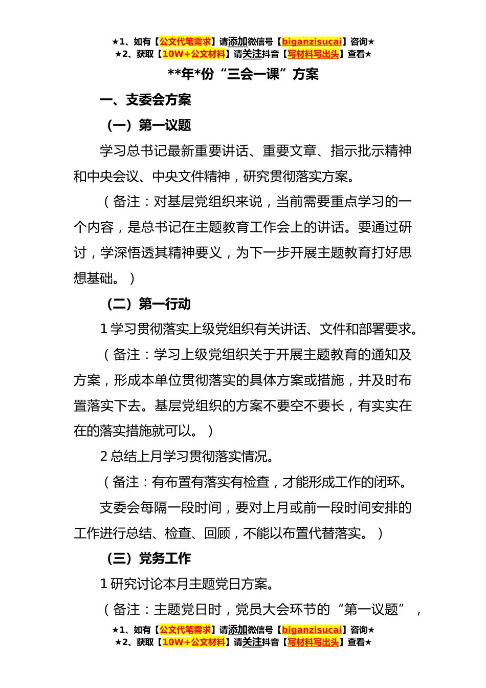 ★1、如有【公文代笔需求】请添加微信号【biganzisucai】咨询★★2、获取【10W+公文材料】请关注抖音【写材料写出头】查看★**年*份“三会一课”方案一、支委会方案(一)第一议题学习总书记最新重要讲话、重要文章、指示批示精神和中央会议、中央文件精神,研究贯彻落实方案。(备注:对基层党组织来说,当前需要重点学习的一个内容,是总书记在主题教育工作会上的讲话。要通过研讨,学深悟透其精神要义,为下一步开展主题教育打好思想基础。)(二)第一行动1学习贯彻落实上级党组织有关讲话、文件和部署要求。(备注:学习上级党组织关于开展主题教育的通知及方案,形成本单位贯彻落实的具体方案或措施,并及时布置落实下去。基层党组织的方案不要空不要长,有实实在在的落实措施就可以。)2总结上月学习贯彻落...