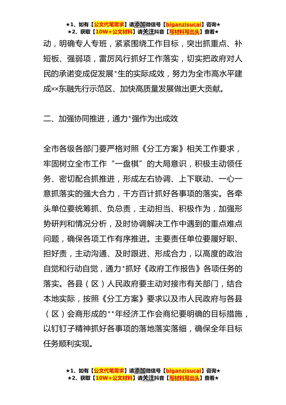 ★1、如有【公文代笔需求】请添加微信号【biganzisucai】咨询★★2、获取【10W+公文材料】请关注抖音【写材料写出头】查看★**年在XX市政府工作报告重要目标和重点工作任务分工方案为确保××市**年《政府工作报告》所明确的重要目标和重点工作任务顺利有效推进,制定《××市**年政府工作报告重要目标和重点工作任务分工方案》(以下简称《分工方案》),并明确相关工作要求如下:一、勇于担当实干,履职尽责强落实促发展《政府工作报告》凝聚了社会各方智慧,是市政府响应人民期盼、坚持执政为民的重要体现。全市各级各部门要始终把人民群众对美好生活的向往作为工作出发点和落脚点将《政府工作报告》确定的重要目标和重点工作任务作为履职尽责、担当干事的重中之重,准确把握市情实际,从大势上着眼、关键点入...