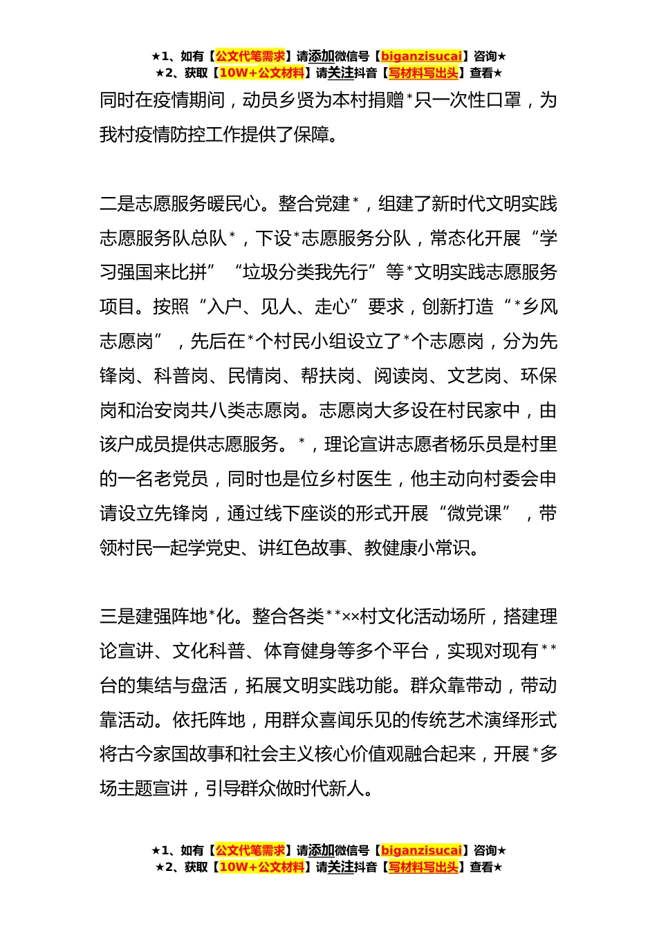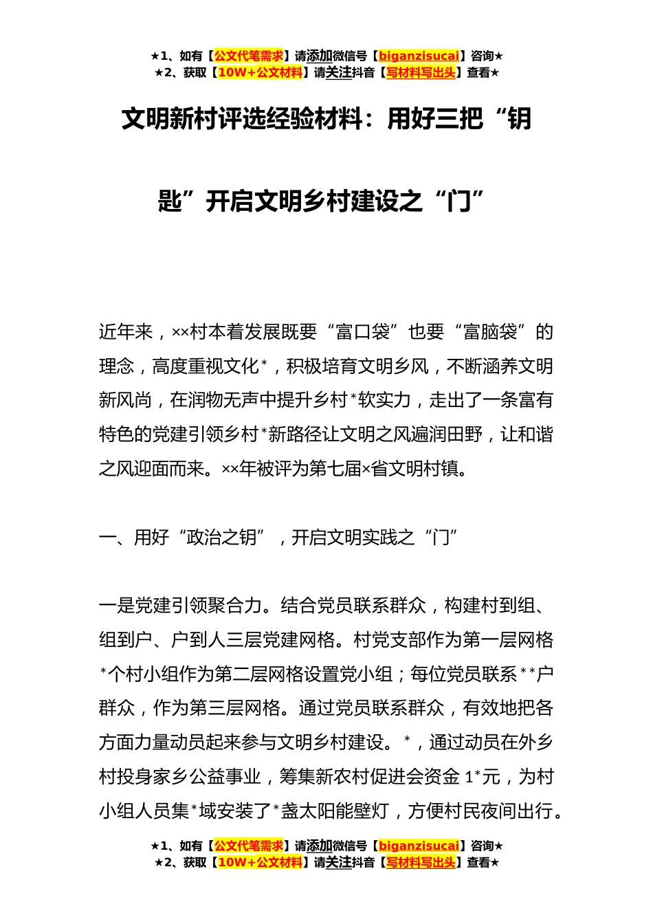 ★1、如有【公文代笔需求】请添加微信号【biganzisucai】咨询★★2、获取【10W+公文材料】请关注抖音【写材料写出头】查看★文明新村评选经验材料:用好三把“钥匙”开启文明乡村建设之“门”近年来,××村本着发展既要“富口袋”也要“富脑袋”的理念,高度重视文化*,积极培育文明乡风,不断涵养文明新风尚,在润物无声中提升乡村*软实力,走出了一条富有特色的党建引领乡村*新路径让文明之风遍润田野,让和谐之风迎面而来。××年被评为第七届×省文明村镇。一、用好“政治之钥”,开启文明实践之“门”一是党建引领聚合力。结合党员联系群众,构建村到组、组到户、户到人三层党建网格。村党支部作为第一层网格*个村小组作为第二层网格设置党小组;每位党员联系**户群众,作为第三层网格。通过党员联系群众,...