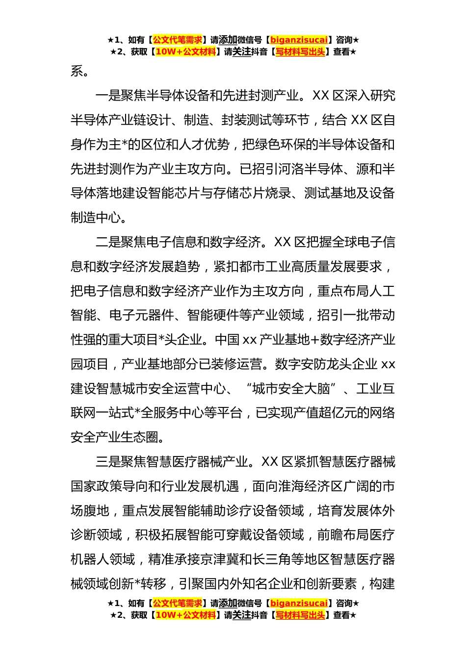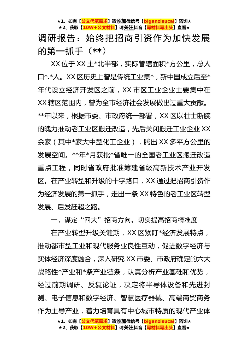 ★1、如有【公文代笔需求】请添加微信号【biganzisucai】咨询★★2、获取【10W+公文材料】请关注抖音【写材料写出头】查看★调研报告:始终把招商引资作为加快发展的第一抓手(**)XX位于XX主*北半部,实际管辖面积*方公里,总人口*.*人。XX区历史上曾是传统工业集*,新中国成立后至*年代设立经济开发区之前,XX市区工业企业主要集中在XX辖区范围内,曾为全市经济社会发展做出过重大贡献。**年以来,根据市委、市政府统一部署,XX区以壮士断腕的魄力推动老工业区搬迁改造,先后关闭搬迁工业企业XX余家(其中*家大中型化工企业),腾出XX多平方公里的发展空间。**年*月获批*省唯一的全国老工业区搬迁改造重点工程,同时省政府批准筹建省级高新技术产业开发区。在产业转型和升级的十字路口,XX通过把招商引资作为经...