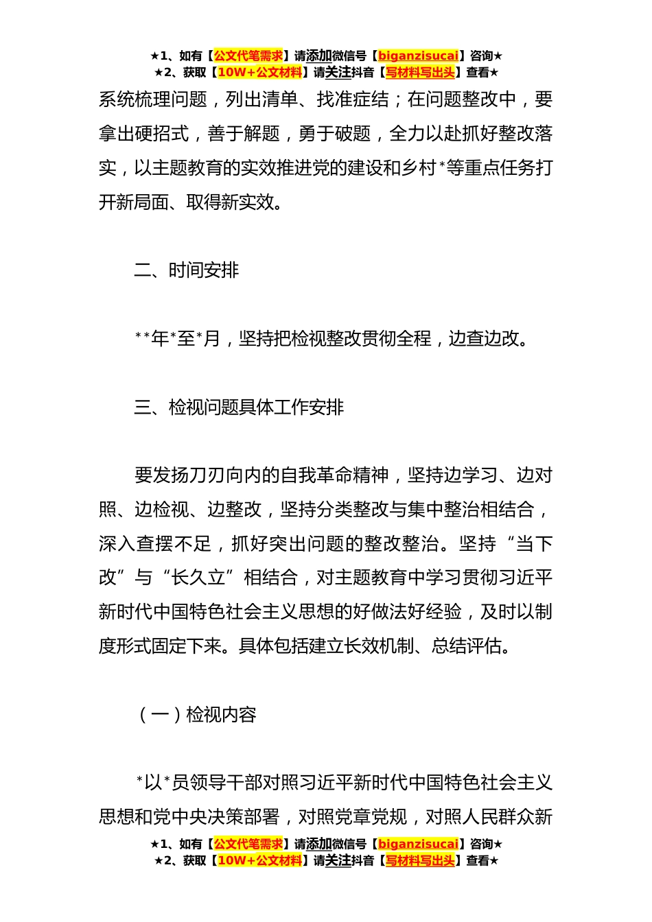 ★1、如有【公文代笔需求】请添加微信号【biganzisucai】咨询★★2、获取【10W+公文材料】请关注抖音【写材料写出头】查看★**年主题教育检视问题实施方案为认真贯彻落实习近平新时代中国特色社会主义思想主题教育总体安排部署,落实“学思想、强党性、重实践建新功”总要求,教育引导党员干部突出问题导向,查不足、找差距、明方向,接受政治体检,打扫政治灰尘,纠正行为偏差,解决思想不纯、组织不纯方面存在的突出问题,把自己摆进去,把工作摆进去,善于以强化理论学习指导发展实践,以深化调查研究推动解决发展难题,将焕发出来的学习、工作热情转化为攻坚克难、干事创业的强大动力,现就开展检视问题工作提出如下方案。一、总体要求深入贯彻中央和主题教育工作会议精神,按照主题教育实施方案要求,教育引...
