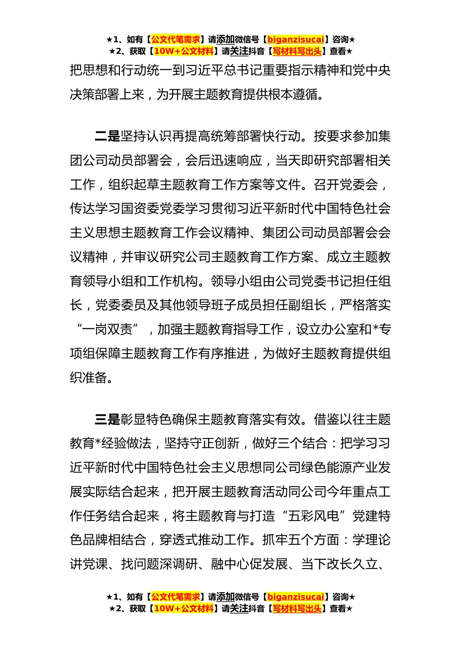 ★1、如有【公文代笔需求】请添加微信号【biganzisucai】咨询★★2、获取【10W+公文材料】请关注抖音【写材料写出头】查看★国企**年主题教育筹备情况报告根据会议安排,现将公司学习贯彻习近平新时代中国特色社会主义思想主题教育筹备开展情况汇报如下:一、动员部署情况党中央决定,从*开始,分两批在全党深入开展学习贯彻习近平新时代中国特色社会主义思想主题教育,是党的XX大作出的重大部署。公司党委决贯彻落实党中央决策部署求,在上级党委的统筹部署下,全面对标对表,切实把开展好主题教育作为当前一项重要政治任务抓紧抓好,扎实推进各项筹备工作。一是强化理论学习筑牢主题教育的思想基础。公司党委支以“第一议题”形式学习习近平总书记在中央学习贯彻习近平新时代中国特色社会主义思想主题教育工作会...