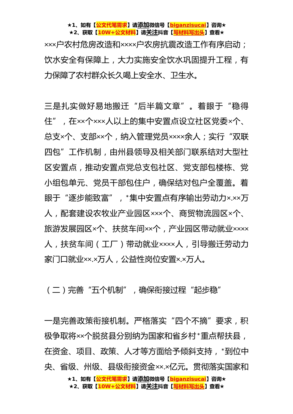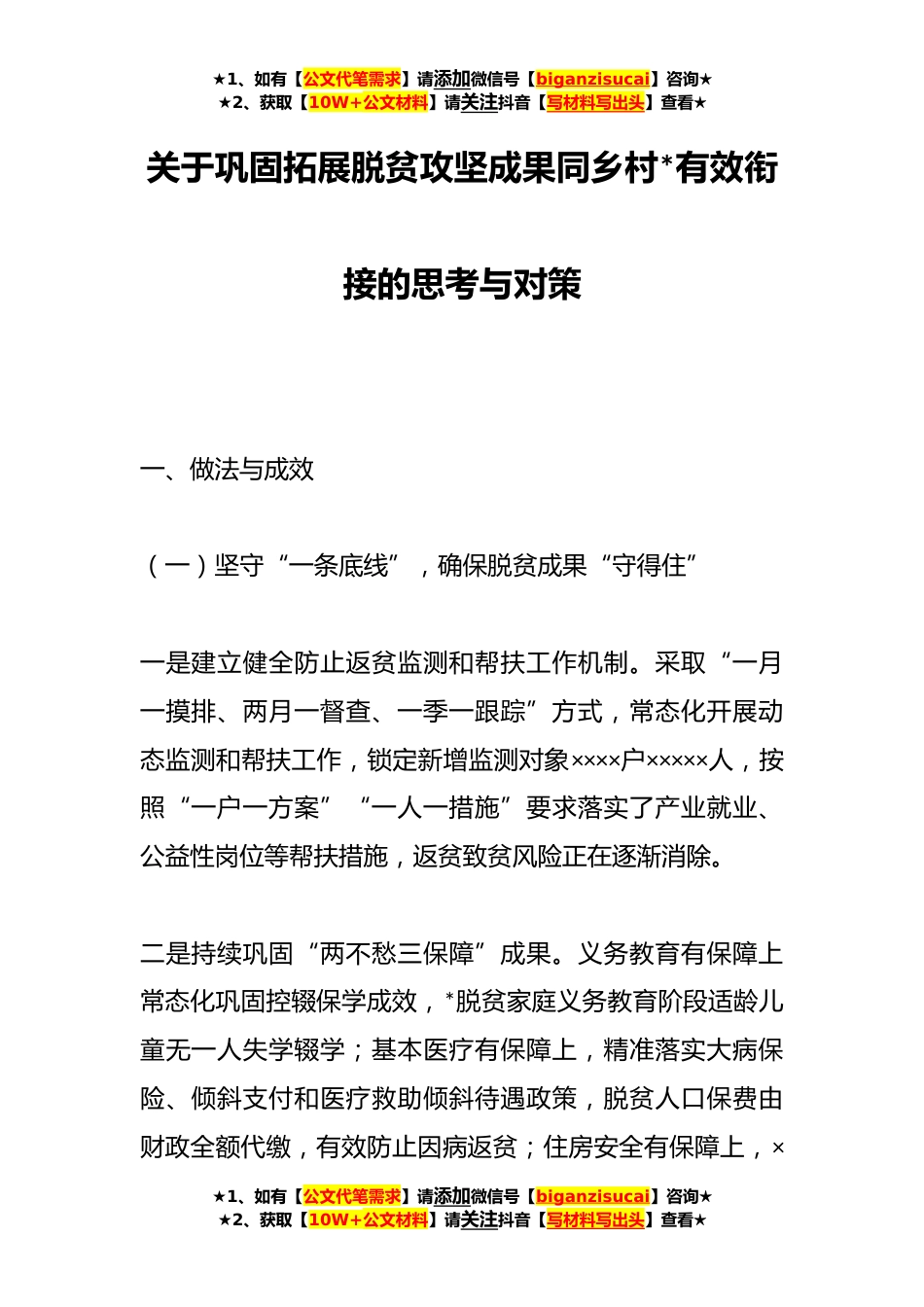 ★1、如有【公文代笔需求】请添加微信号【biganzisucai】咨询★★2、获取【10W+公文材料】请关注抖音【写材料写出头】查看★关于巩固拓展脱贫攻坚成果同乡村*有效衔接的思考与对策一、做法与成效(一)坚守“一条底线”,确保脱贫成果“守得住”一是建立健全防止返贫监测和帮扶工作机制。采取“一月一摸排、两月一督查、一季一跟踪”方式,常态化开展动态监测和帮扶工作,锁定新增监测对象××××户×××××人,按照“一户一方案”“一人一措施”要求落实了产业就业、公益性岗位等帮扶措施,返贫致贫风险正在逐渐消除。二是持续巩固“两不愁三保障”成果。义务教育有保障上常态化巩固控辍保学成效,*脱贫家庭义务教育阶段适龄儿童无一人失学辍学;基本医疗有保障上,精准落实大病保险、倾斜支付和医疗救助倾斜...