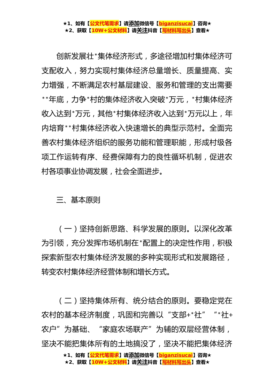 ★1、如有【公文代笔需求】请添加微信号【biganzisucai】咨询★★2、获取【10W+公文材料】请关注抖音【写材料写出头】查看★**年壮*级集体经济实施方案模板为更好发展壮大全镇村级集体经济,增强村级组织服务能力,进一步夯实党在农村的工作基础,巩固拓展脱贫攻坚成果,推进乡村*战略实施,实现农业强、农村美、农民富的良好局面。结合全镇实际,现就坚持和加强农村基层党组织领导扶持壮*级集体经济,制定以下实施方案。一、指导思想坚持以党的二十大精神和习近平新时代中国特色社会主义思想为指导,认真贯彻落实中央及省市县关于发展壮*级集体经济的各项决策部署,以实施乡村*战略为总抓手,充分发挥农村基层党组织战斗堡垒作用,紧扣扶持“薄弱”村、壮大“*”村的目标,精准分类施策,拓宽增收途径,因地制宜...
