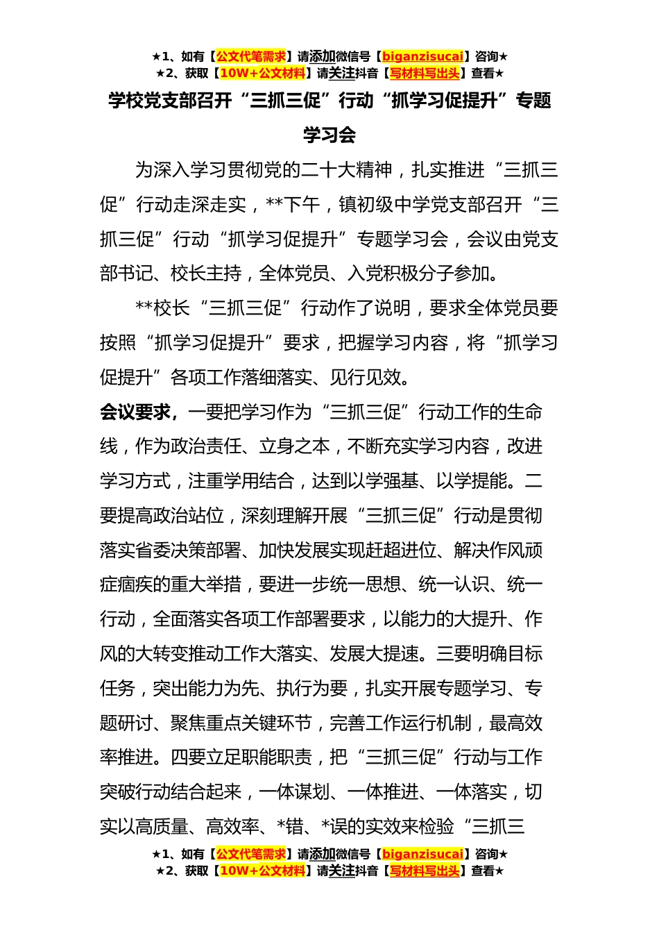 ★1、如有【公文代笔需求】请添加微信号【biganzisucai】咨询★★2、获取【10W+公文材料】请关注抖音【写材料写出头】查看★学校党支部召开“三抓三促”行动“抓学习促提升”专题学习会为深入学习贯彻党的二十大精神,扎实推进“三抓三促”行动走深走实,**下午,镇初级中学党支部召开“三抓三促”行动“抓学习促提升”专题学习会,会议由党支部书记、校长主持,全体党员、入党积极分子参加。**校长“三抓三促”行动作了说明,要求全体党员要按照“抓学习促提升”要求,把握学习内容,将“抓学习促提升”各项工作落细落实、见行见效。会议要求,一要把学习作为“三抓三促”行动工作的生命线,作为政治责任、立身之本,不断充实学习内容,改进学习方式,注重学用结合,达到以学强基、以学提能。二要提高政治站位,...