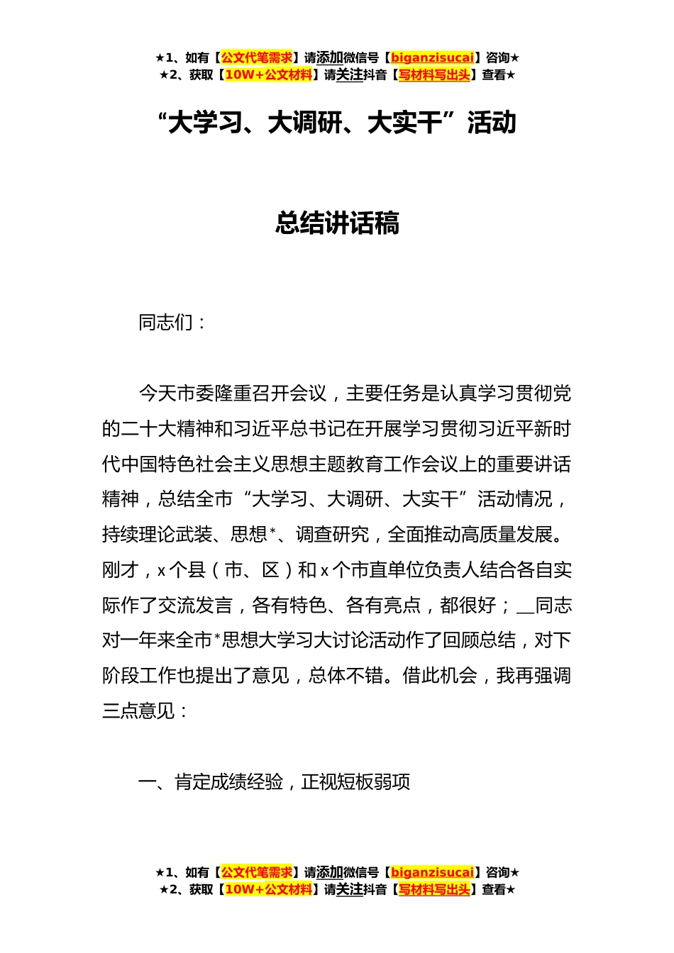 ★1、如有【公文代笔需求】请添加微信号【biganzisucai】咨询★★2、获取【10W+公文材料】请关注抖音【写材料写出头】查看★“大学习、大调研、大实干”活动总结讲话稿同志们:今天市委隆重召开会议,主要任务是认真学习贯彻党的二十大精神和习近平总书记在开展学习贯彻习近平新时代中国特色社会主义思想主题教育工作会议上的重要讲话精神,总结全市“大学习、大调研、大实干”活动情况,持续理论武装、思想*、调查研究,全面推动高质量发展。刚才,x个县(市、区)和x个市直单位负责人结合各自实际作了交流发言,各有特色、各有亮点,都很好;__同志对一年来全市*思想大学习大讨论活动作了回顾总结,对下阶段工作也提出了意见,总体不错。借此机会,我再强调三点意见:一、肯定成绩经验,正视短板弱项★1、如有【...