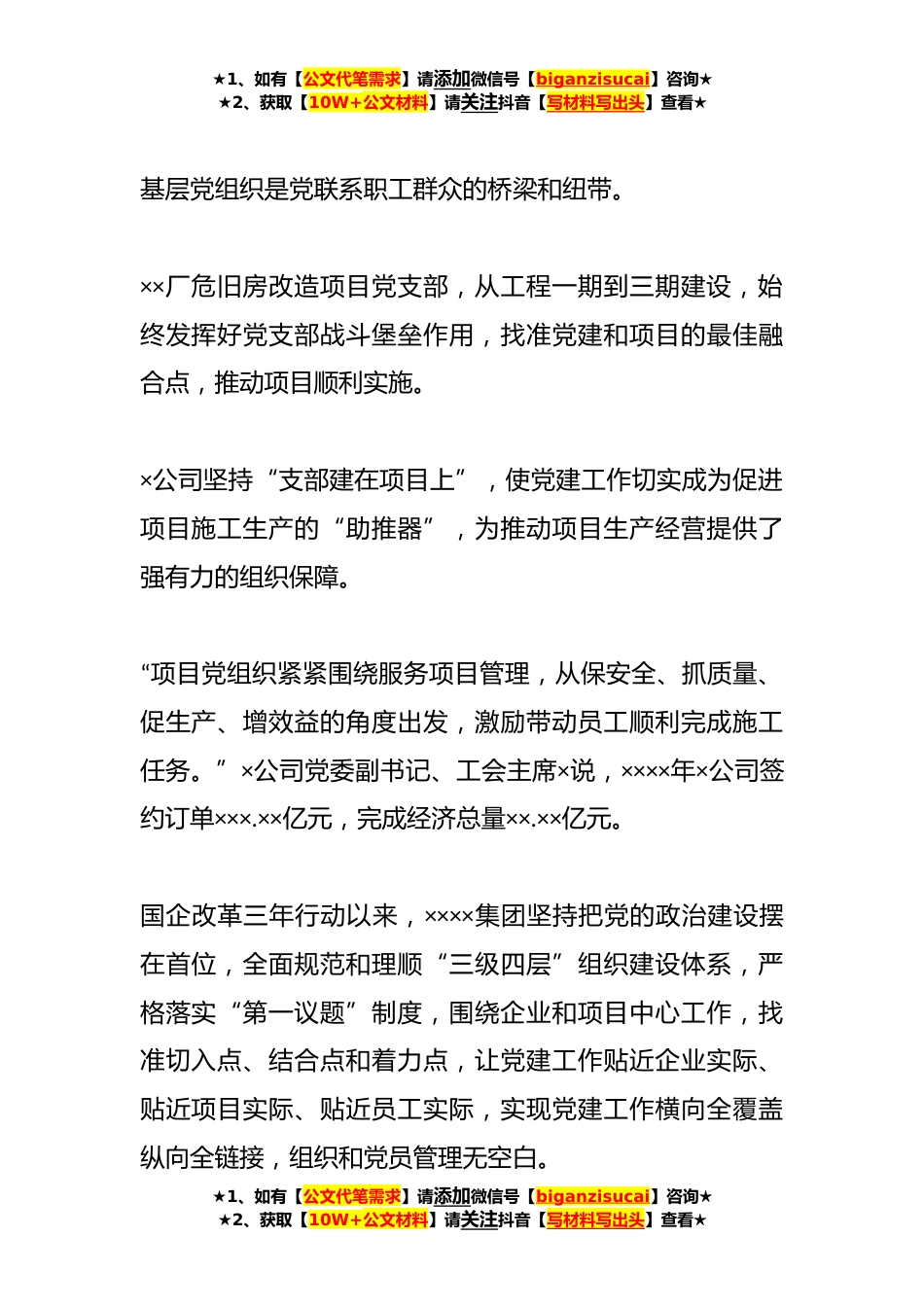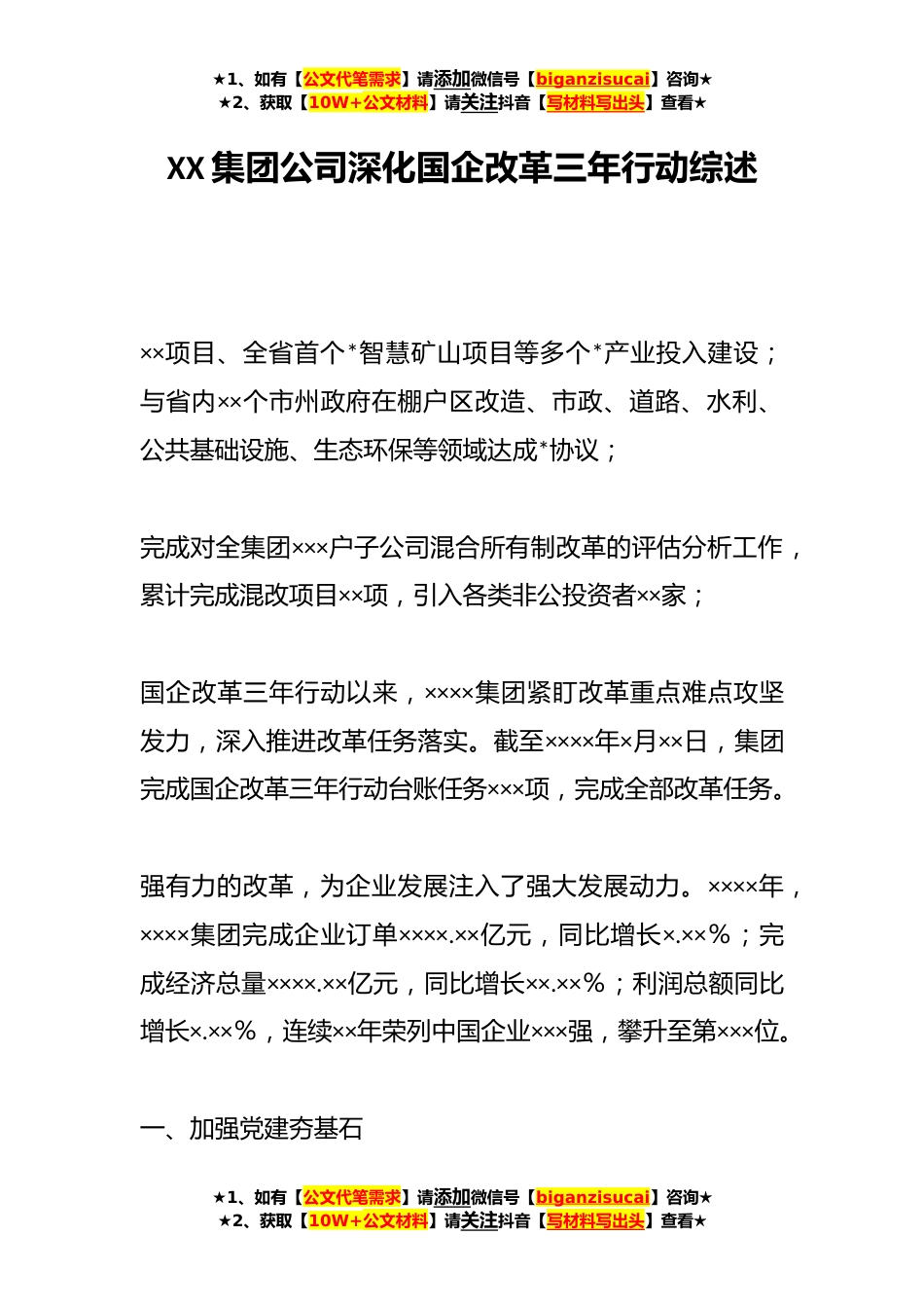 ★1、如有【公文代笔需求】请添加微信号【biganzisucai】咨询★★2、获取【10W+公文材料】请关注抖音【写材料写出头】查看★XX集团公司深化国企改革三年行动综述××项目、全省首个*智慧矿山项目等多个*产业投入建设;与省内××个市州政府在棚户区改造、市政、道路、水利、公共基础设施、生态环保等领域达成*协议;完成对全集团×××户子公司混合所有制改革的评估分析工作,累计完成混改项目××项,引入各类非公投资者××家;国企改革三年行动以来,××××集团紧盯改革重点难点攻坚发力,深入推进改革任务落实。截至××××年×月××日,集团完成国企改革三年行动台账任务×××项,完成全部改革任务。强有力的改革,为企业发展注入了强大发展动力。××××年,××××集团完成企业订单××××.××亿...