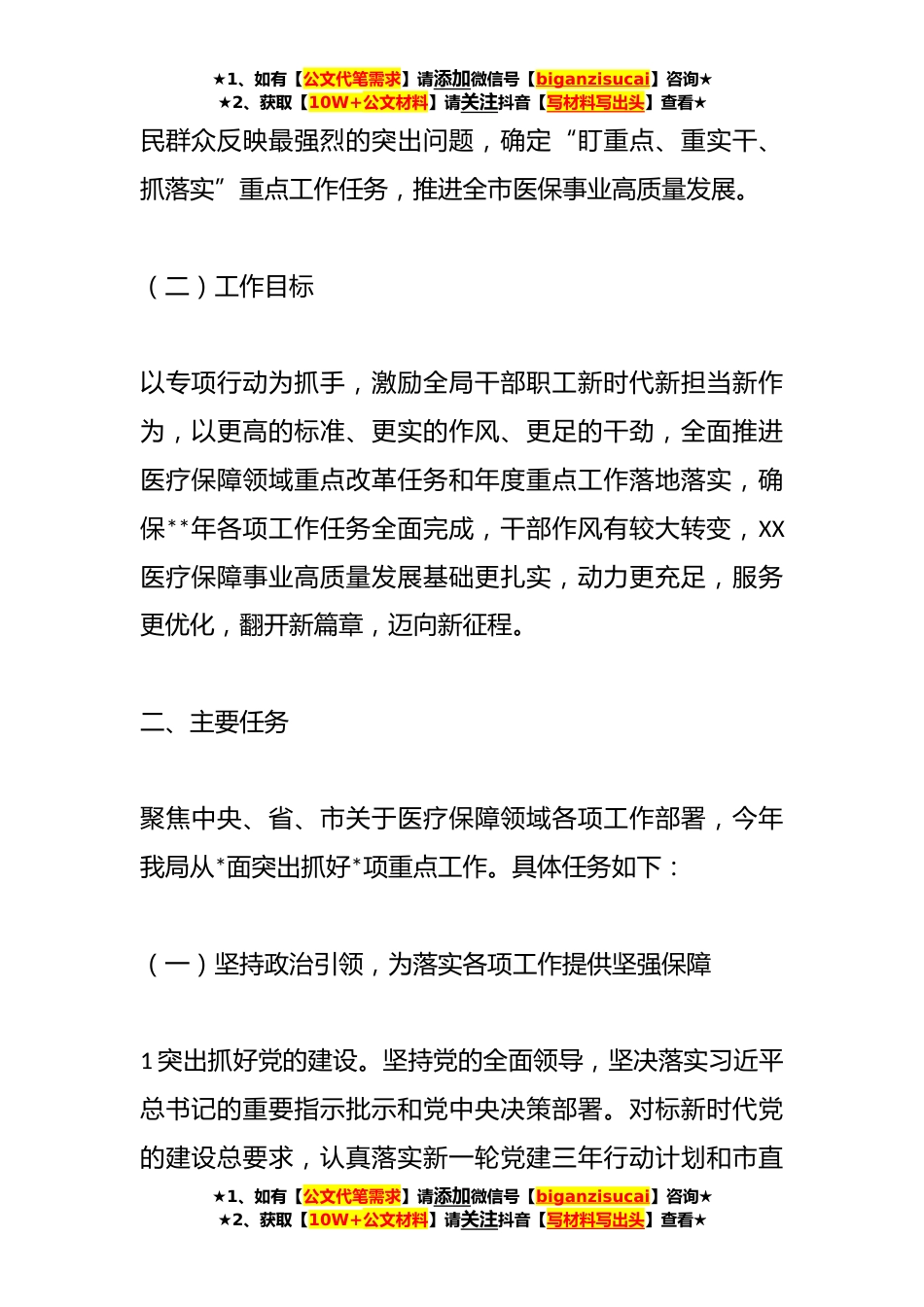 ★1、如有【公文代笔需求】请添加微信号【biganzisucai】咨询★★2、获取【10W+公文材料】请关注抖音【写材料写出头】查看★X市医疗保障局在**年“盯重点、重实干、抓落实”专项行动实施方案**年是全面贯彻落实党的XX大精神的开局之年。为深入贯彻落实国家、省医疗保障工作会议精神和市委市政府部署要求,积极营造“竞标争先”、“比学赶超”浓厚氛围,科学谋划**年全市医疗保障重点工作,切实推动各项任务落细落实,结合我市医疗保障工作实际,制定本实施方案。一、总体要求(一)指导思想坚持以习近平新时代中国特色社会主义思想为指导,全面贯彻党的XX大精神,坚持以人民为中心,坚持稳字当头、稳中求进的总基调,深入落实*省高质量发展工作会议精神及市委市政府工作部署,紧紧围绕市委市政府中心工作和省医保...