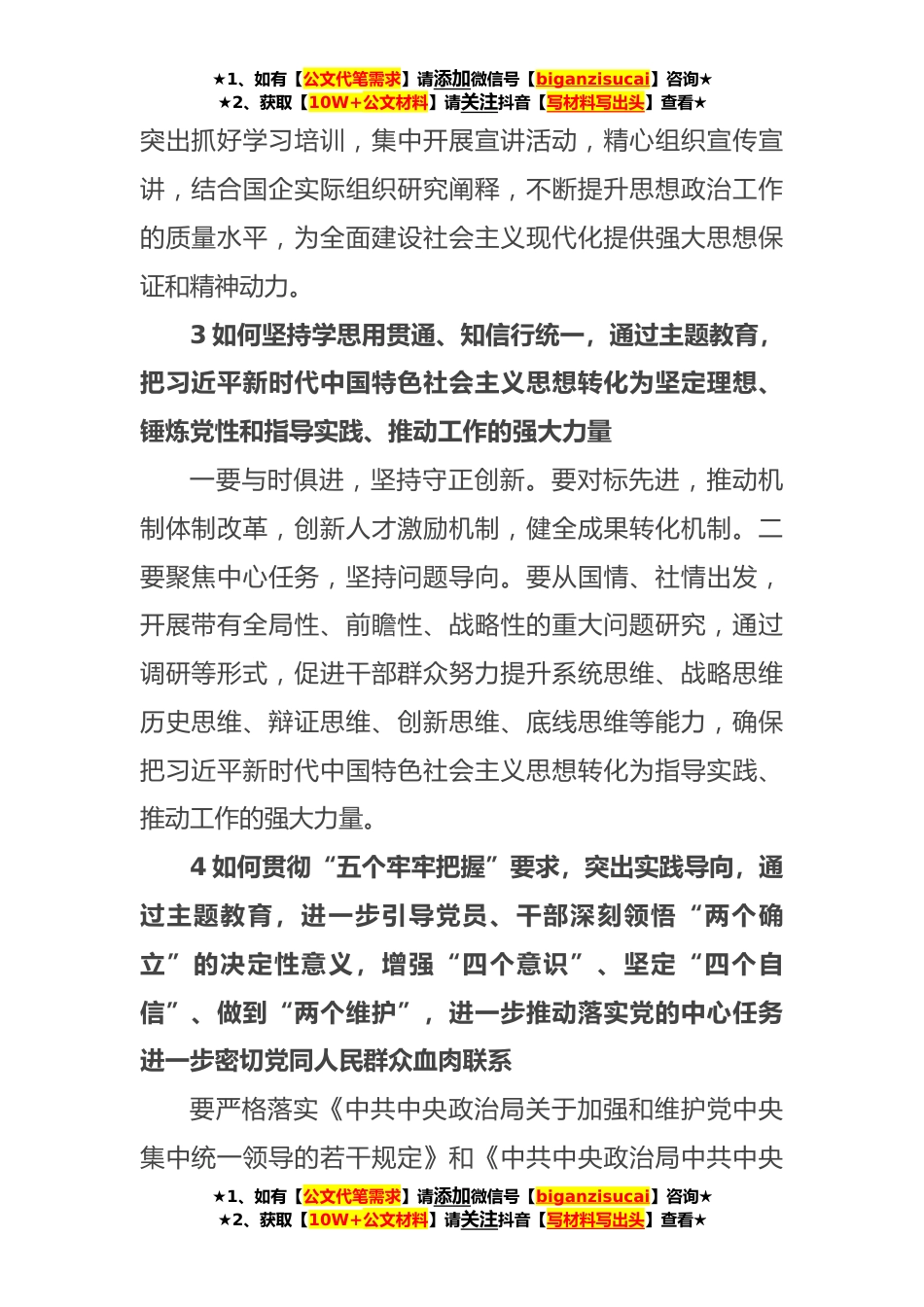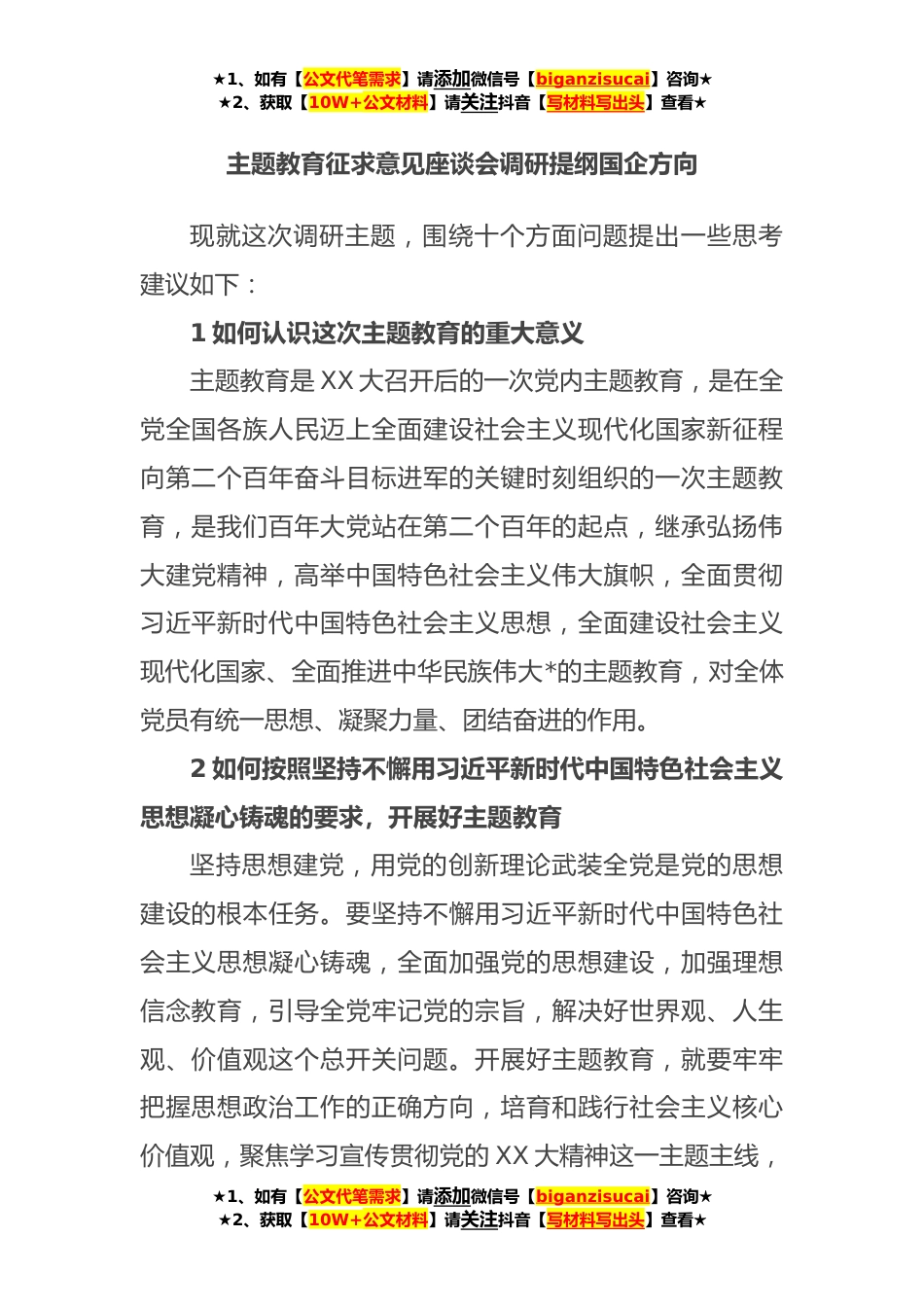 ★1、如有【公文代笔需求】请添加微信号【biganzisucai】咨询★★2、获取【10W+公文材料】请关注抖音【写材料写出头】查看★主题教育征求意见座谈会调研提纲国企方向现就这次调研主题,围绕十个方面问题提出一些思考建议如下:1如何认识这次主题教育的重大意义主题教育是XX大召开后的一次党内主题教育,是在全党全国各族人民迈上全面建设社会主义现代化国家新征程向第二个百年奋斗目标进军的关键时刻组织的一次主题教育,是我们百年大党站在第二个百年的起点,继承弘扬伟大建党精神,高举中国特色社会主义伟大旗帜,全面贯彻习近平新时代中国特色社会主义思想,全面建设社会主义现代化国家、全面推进中华民族伟大*的主题教育,对全体党员有统一思想、凝聚力量、团结奋进的作用。2如何按照坚持不懈用习近平新时代中...