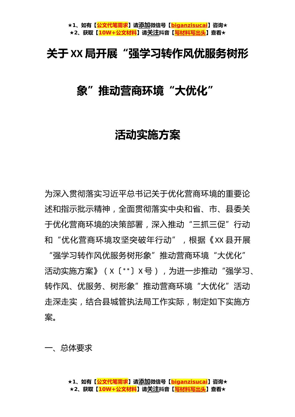 ★1、如有【公文代笔需求】请添加微信号【biganzisucai】咨询★★2、获取【10W+公文材料】请关注抖音【写材料写出头】查看★关于XX局开展“强学习转作风优服务树形象”推动营商环境“大优化”活动实施方案为深入贯彻落实习近平总书记关于优化营商环境的重要论述和指示批示精神,全面贯彻落实中央和省、市、县委关于优化营商环境的决策部署,深入推动“三抓三促”行动和“优化营商环境攻坚突破年行动”,根据《XX县开展“强学习转作风优服务树形象”推动营商环境“大优化”活动实施方案》(X〔**〕X号),为进一步推动“强学习、转作风、优服务、树形象”推动营商环境“大优化”活动走深走实,结合县城管执法局工作实际,制定如下实施方案。一、总体要求★1、如有【公文代笔需求】请添加微信号【biganzisucai】咨询...