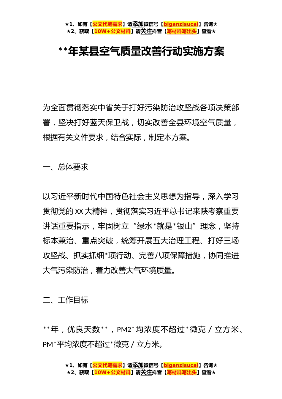 ★1、如有【公文代笔需求】请添加微信号【biganzisucai】咨询★★2、获取【10W+公文材料】请关注抖音【写材料写出头】查看★**年某县空气质量改善行动实施方案为全面贯彻落实中省关于打好污染防治攻坚战各项决策部署,坚决打好蓝天保卫战,切实改善全县环境空气质量,根据有关文件要求,结合实际,制定本方案。一、总体要求以习近平新时代中国特色社会主义思想为指导,深入学习贯彻党的XX大精神,贯彻落实习近平总书记来陕考察重要讲话重要指示,牢固树立“绿水*就是*银山”理念,坚持标本兼治、重点突破,统筹开展五大治理工程、打好三场攻坚战、抓实抓细*项行动、完善八项保障措施,协同推进大气污染防治,着力改善大气环境质量。二、工作目标**年,优良天数**,PM2*均浓度不超过*微克/立方米、PM*平均浓度不超...