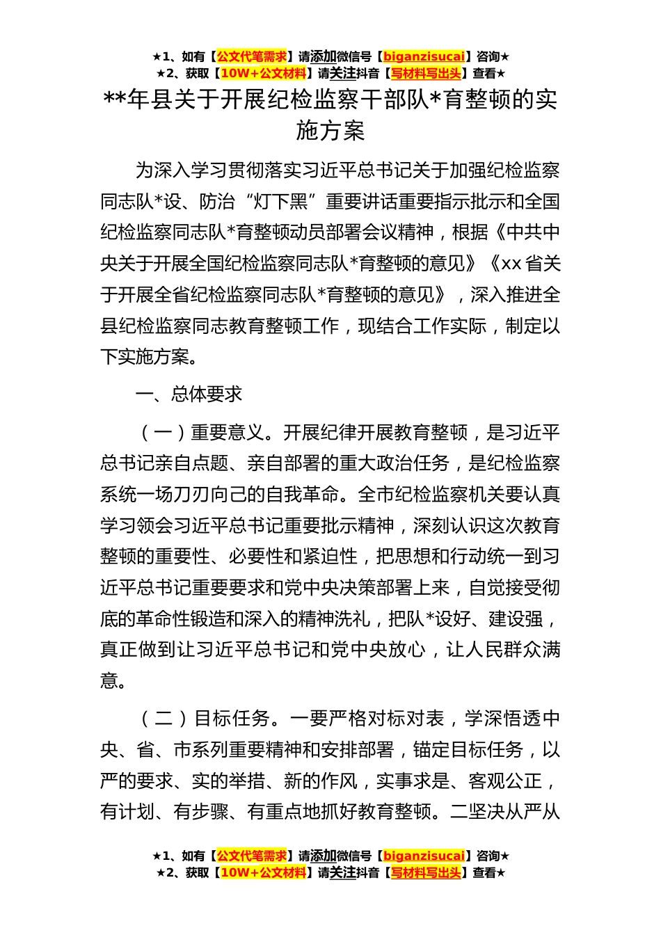 ★1、如有【公文代笔需求】请添加微信号【biganzisucai】咨询★★2、获取【10W+公文材料】请关注抖音【写材料写出头】查看★**年县关于开展纪检监察干部队*育整顿的实施方案为深入学习贯彻落实习近平总书记关于加强纪检监察同志队*设、防治“灯下黑”重要讲话重要指示批示和全国纪检监察同志队*育整顿动员部署会议精神,根据《中共中央关于开展全国纪检监察同志队*育整顿的意见》《xx省关于开展全省纪检监察同志队*育整顿的意见》,深入推进全县纪检监察同志教育整顿工作,现结合工作实际,制定以下实施方案。一、总体要求(一)重要意义。开展纪律开展教育整顿,是习近平总书记亲自点题、亲自部署的重大政治任务,是纪检监察系统一场刀刃向己的自我革命。全市纪检监察机关要认真学习领会习近平总书记重要批示精神...