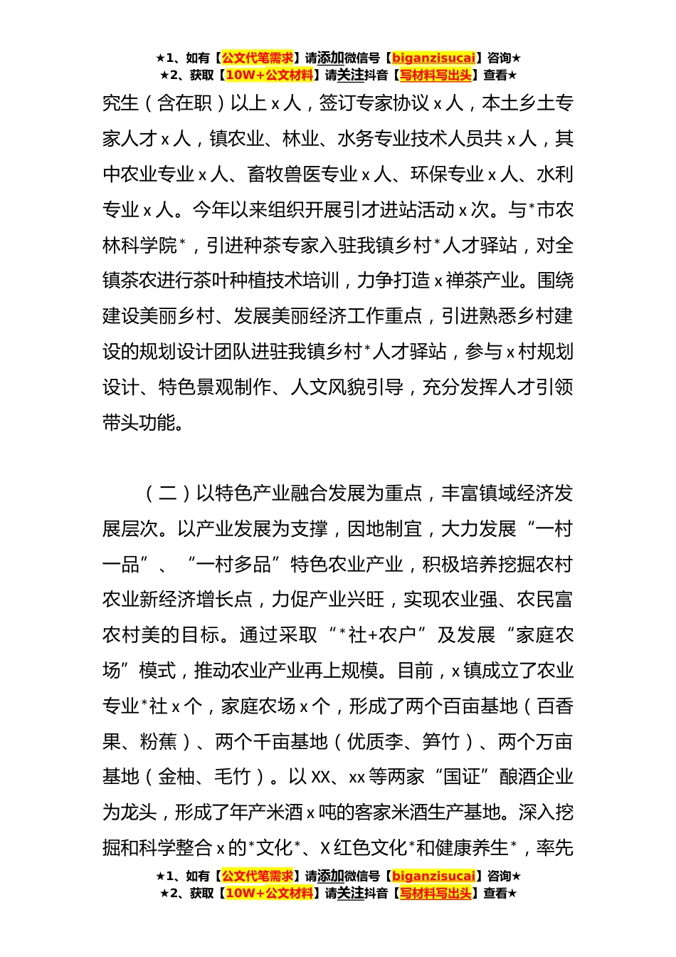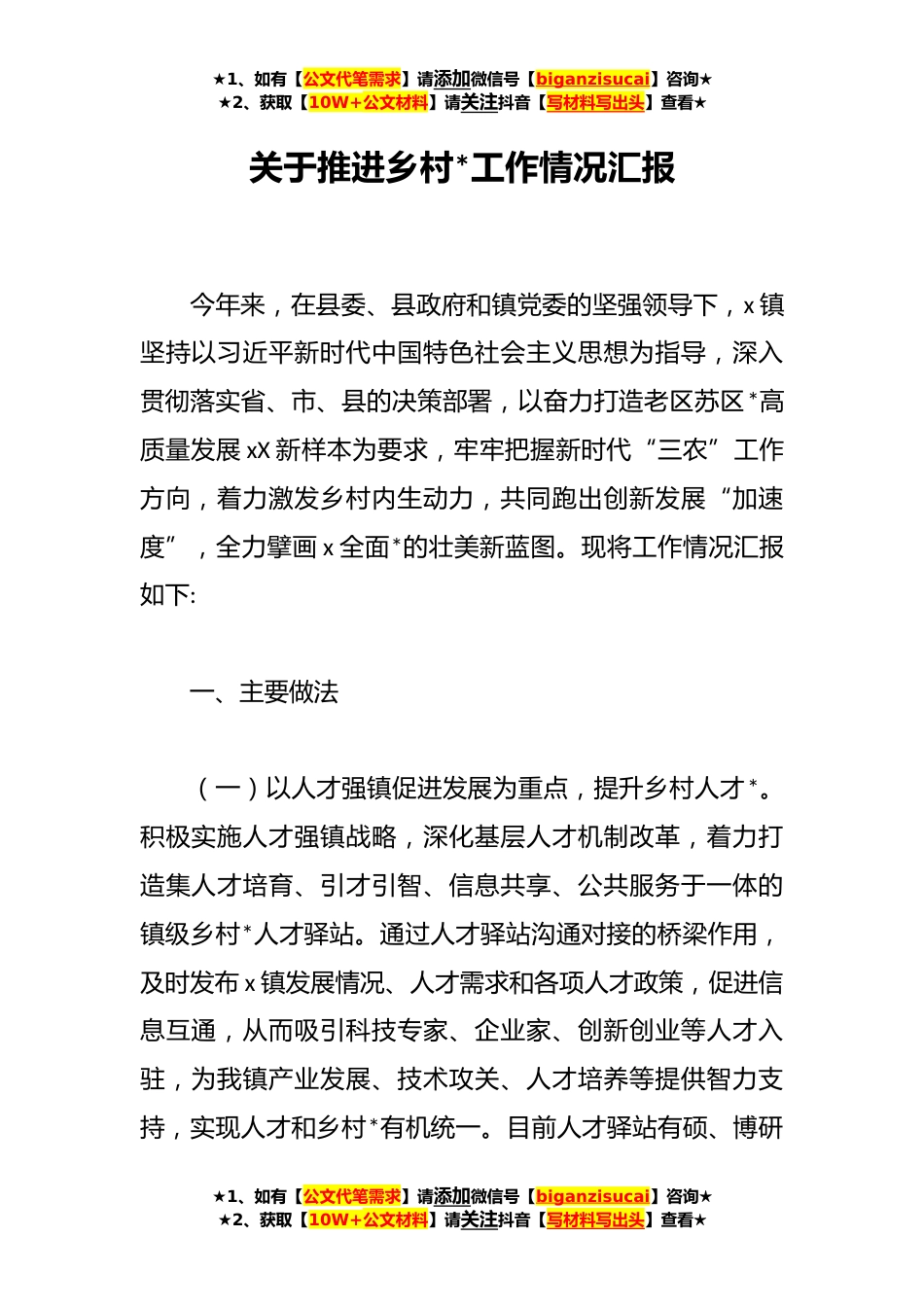 ★1、如有【公文代笔需求】请添加微信号【biganzisucai】咨询★★2、获取【10W+公文材料】请关注抖音【写材料写出头】查看★关于推进乡村*工作情况汇报今年来,在县委、县政府和镇党委的坚强领导下,x镇坚持以习近平新时代中国特色社会主义思想为指导,深入贯彻落实省、市、县的决策部署,以奋力打造老区苏区*高质量发展xX新样本为要求,牢牢把握新时代“三农”工作方向,着力激发乡村内生动力,共同跑出创新发展“加速度”,全力擘画x全面*的壮美新蓝图。现将工作情况汇报如下:一、主要做法(一)以人才强镇促进发展为重点,提升乡村人才*。积极实施人才强镇战略,深化基层人才机制改革,着力打造集人才培育、引才引智、信息共享、公共服务于一体的镇级乡村*人才驿站。通过人才驿站沟通对接的桥梁作用,及时发布x...