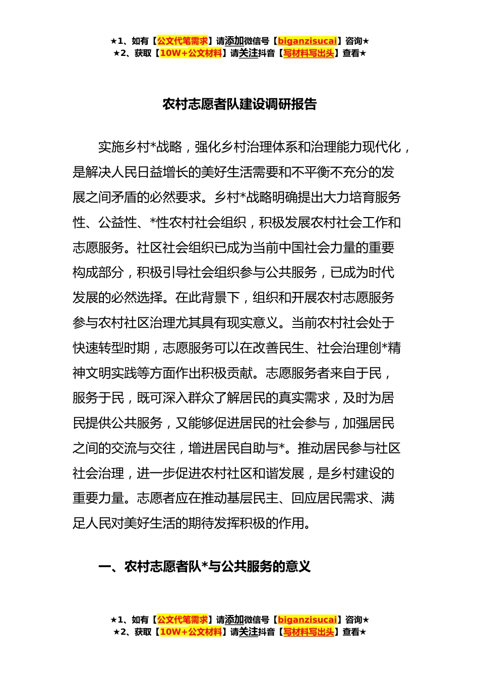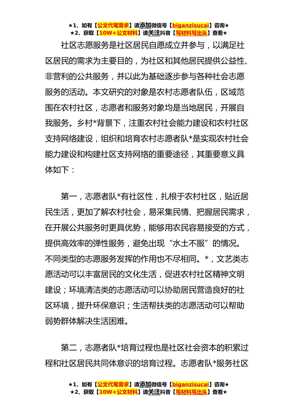 ★1、如有【公文代笔需求】请添加微信号【biganzisucai】咨询★★2、获取【10W+公文材料】请关注抖音【写材料写出头】查看★农村志愿者队建设调研报告实施乡村*战略,强化乡村治理体系和治理能力现代化,是解决人民日益增长的美好生活需要和不平衡不充分的发展之间矛盾的必然要求。乡村*战略明确提出大力培育服务性、公益性、*性农村社会组织,积极发展农村社会工作和志愿服务。社区社会组织已成为当前中国社会力量的重要构成部分,积极引导社会组织参与公共服务,已成为时代发展的必然选择。在此背景下,组织和开展农村志愿服务参与农村社区治理尤其具有现实意义。当前农村社会处于快速转型时期,志愿服务可以在改善民生、社会治理创*精神文明实践等方面作出积极贡献。志愿服务者来自于民,服务于民,既可深入群...