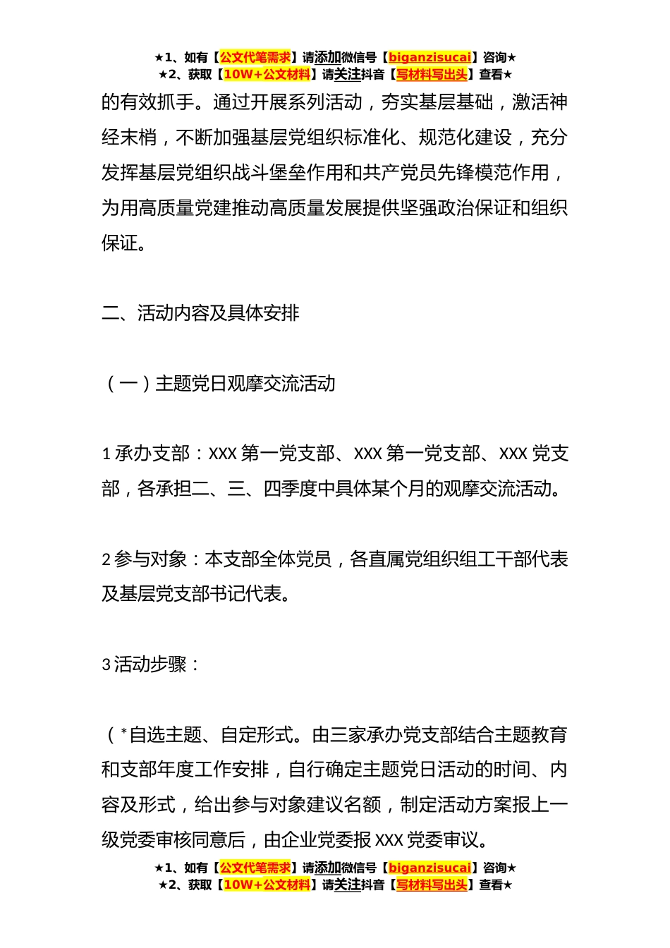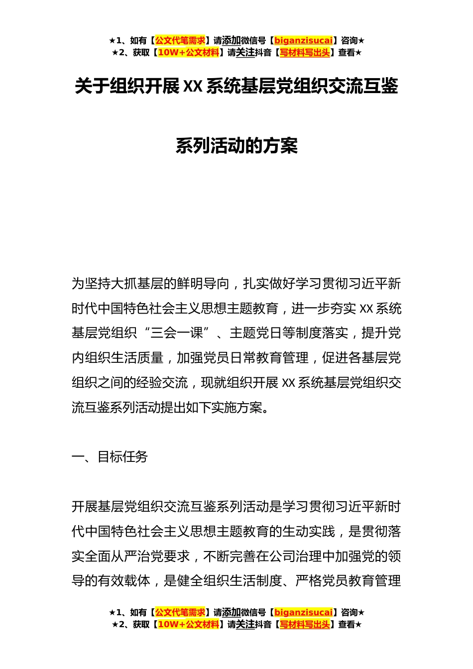 ★1、如有【公文代笔需求】请添加微信号【biganzisucai】咨询★★2、获取【10W+公文材料】请关注抖音【写材料写出头】查看★关于组织开展XX系统基层党组织交流互鉴系列活动的方案为坚持大抓基层的鲜明导向,扎实做好学习贯彻习近平新时代中国特色社会主义思想主题教育,进一步夯实XX系统基层党组织“三会一课”、主题党日等制度落实,提升党内组织生活质量,加强党员日常教育管理,促进各基层党组织之间的经验交流,现就组织开展XX系统基层党组织交流互鉴系列活动提出如下实施方案。一、目标任务开展基层党组织交流互鉴系列活动是学习贯彻习近平新时代中国特色社会主义思想主题教育的生动实践,是贯彻落实全面从严治党要求,不断完善在公司治理中加强党的领导的有效载体,是健全组织生活制度、严格党员教育管理★1...