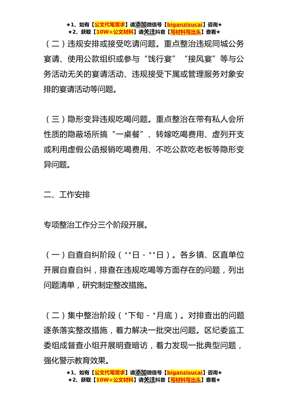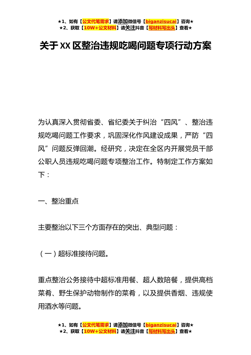 ★1、如有【公文代笔需求】请添加微信号【biganzisucai】咨询★★2、获取【10W+公文材料】请关注抖音【写材料写出头】查看★关于XX区整治违规吃喝问题专项行动方案为认真深入贯彻省委、省纪委关于纠治“四风”、整治违规吃喝问题工作要求,巩固深化作风建设成果,严防“四风”问题反弹回潮。经研究,决定在全区内开展党员干部公职人员违规吃喝问题专项整治工作。特制定工作方案如下:一、整治重点主要整治以下三个方面存在的突出、典型问题:(一)超标准接待问题。重点整治公务接待中超标准用餐、超人数陪餐,提供高档菜肴、野生保护动物制作的菜肴,以及提供香烟、违规使用酒水等问题。★1、如有【公文代笔需求】请添加微信号【biganzisucai】咨询★★2、获取【10W+公文材料】请关注抖音【写材料写出头】查看★...