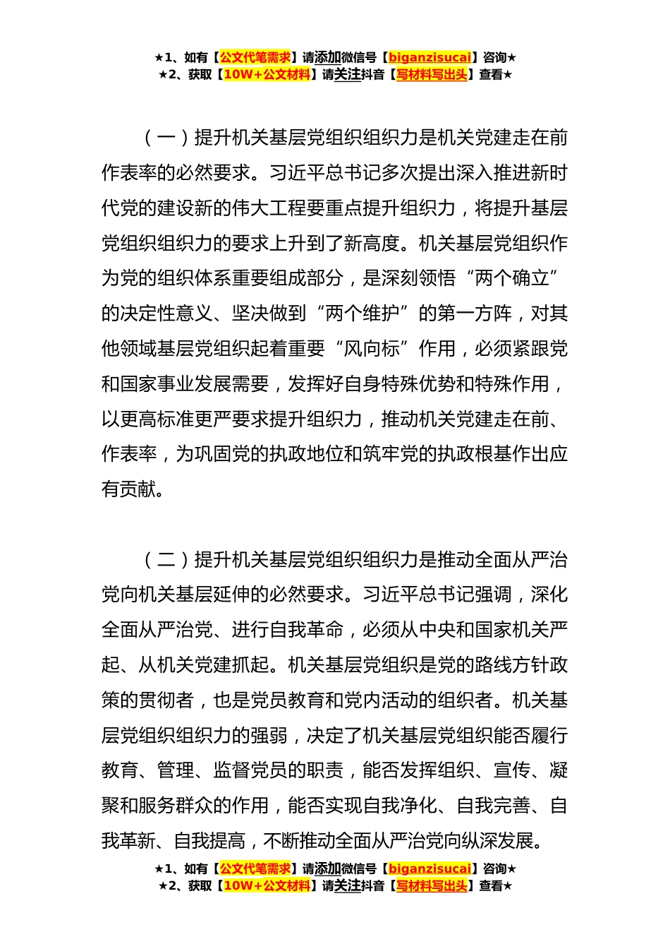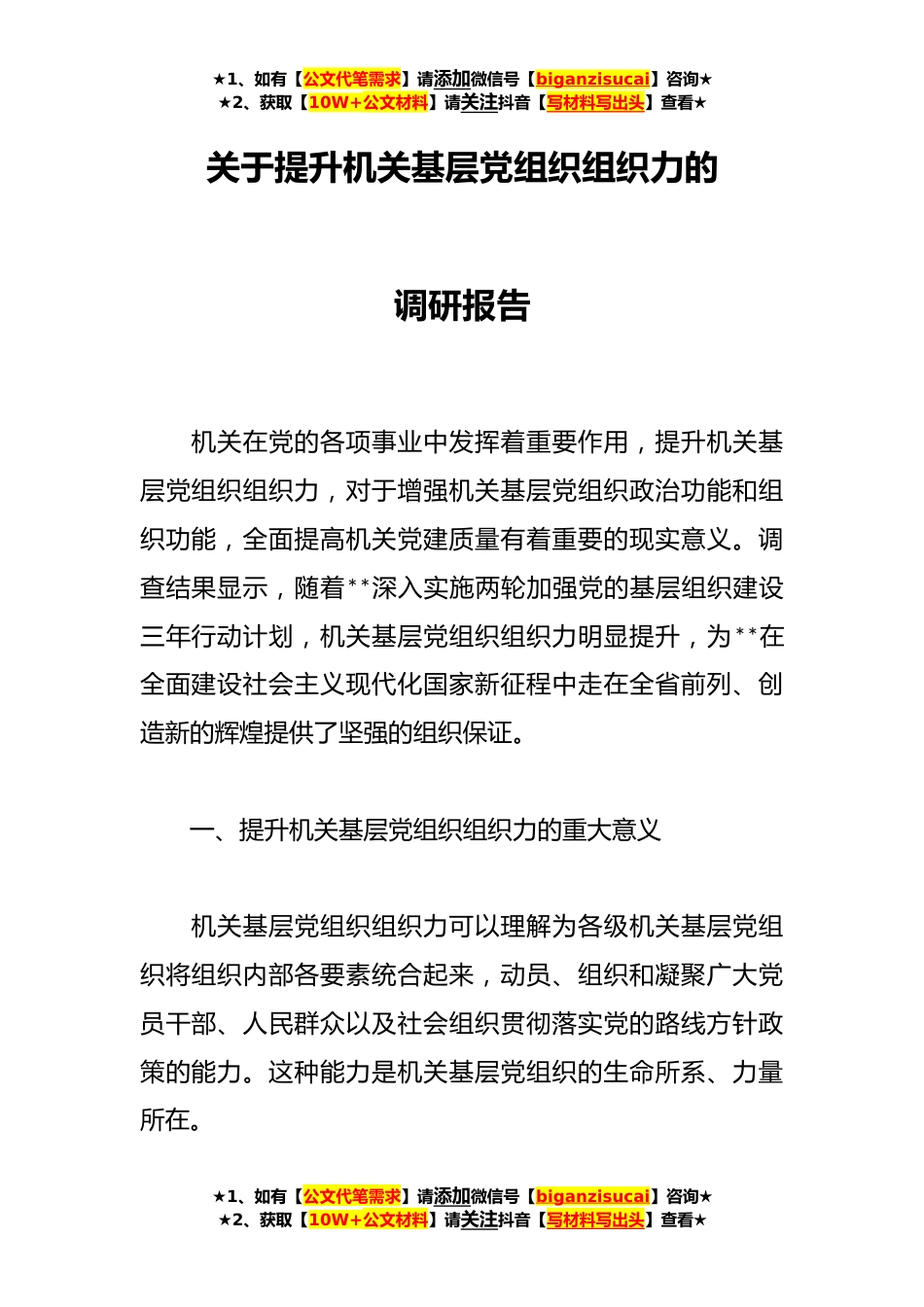 ★1、如有【公文代笔需求】请添加微信号【biganzisucai】咨询★★2、获取【10W+公文材料】请关注抖音【写材料写出头】查看★关于提升机关基层党组织组织力的调研报告机关在党的各项事业中发挥着重要作用,提升机关基层党组织组织力,对于增强机关基层党组织政治功能和组织功能,全面提高机关党建质量有着重要的现实意义。调查结果显示,随着**深入实施两轮加强党的基层组织建设三年行动计划,机关基层党组织组织力明显提升,为**在全面建设社会主义现代化国家新征程中走在全省前列、创造新的辉煌提供了坚强的组织保证。一、提升机关基层党组织组织力的重大意义机关基层党组织组织力可以理解为各级机关基层党组织将组织内部各要素统合起来,动员、组织和凝聚广大党员干部、人民群众以及社会组织贯彻落实党的路线方...