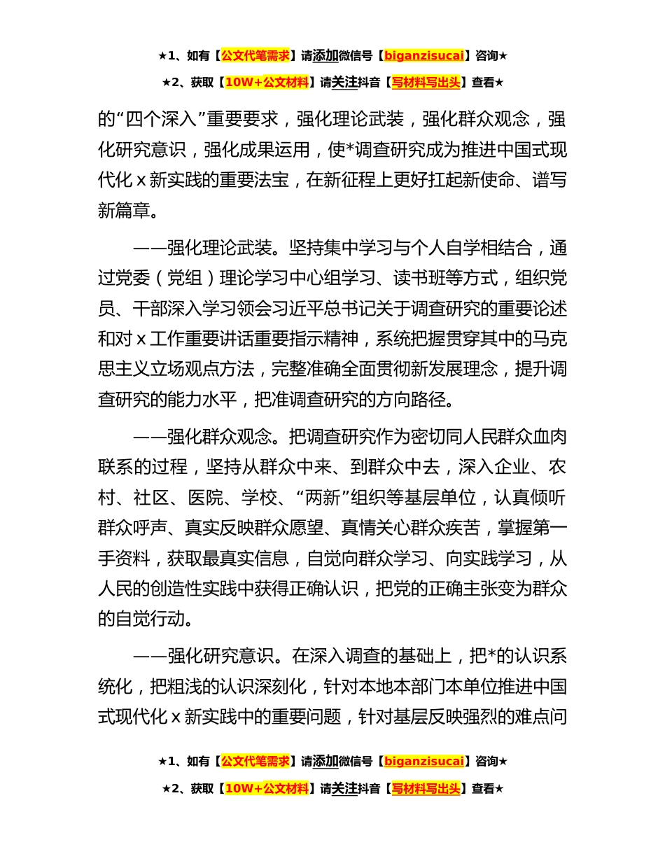 ★1、如有【公文代笔需求】请添加微信号【biganzisucai】咨询★★2、获取【10W+公文材料】请关注抖音【写材料写出头】查看★关于在全市各级党组织和广大党员干部中*调查研究的实施方案为深入学习贯彻习近平新时代中国特色社会主义思想,全面贯彻党中央关于在全党*调查研究的重要部署,动员组织全市各级党组织和广大党员干部广泛深入调查研究,更好落实党的二十大精神和习近平总书记对x工作重要讲话重要指示精神,推动中国式现代化x新实践开好局起好步,根据《中共中央办公厅印发〈关于在全党*调查研究的工作方案〉的通知》和《中共x省委办公厅印发〈关于在全省各级党组织和广大党员干部中*调查研究的实施方案〉的通知》要求,紧密结合x实际,制定本实施方案。一、总体要求坚持以习近平新时代中国特色社会主义思想...