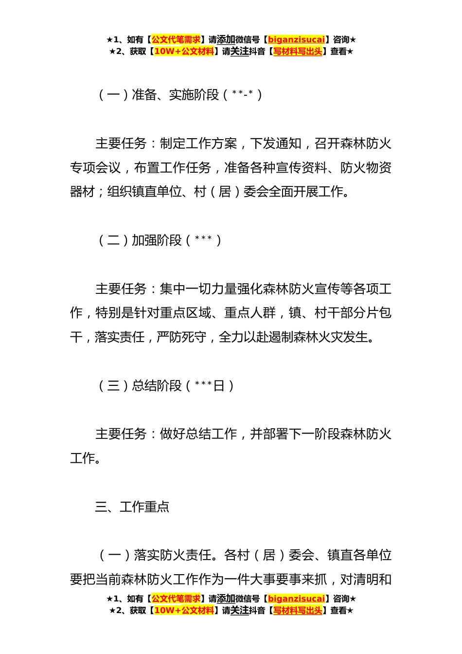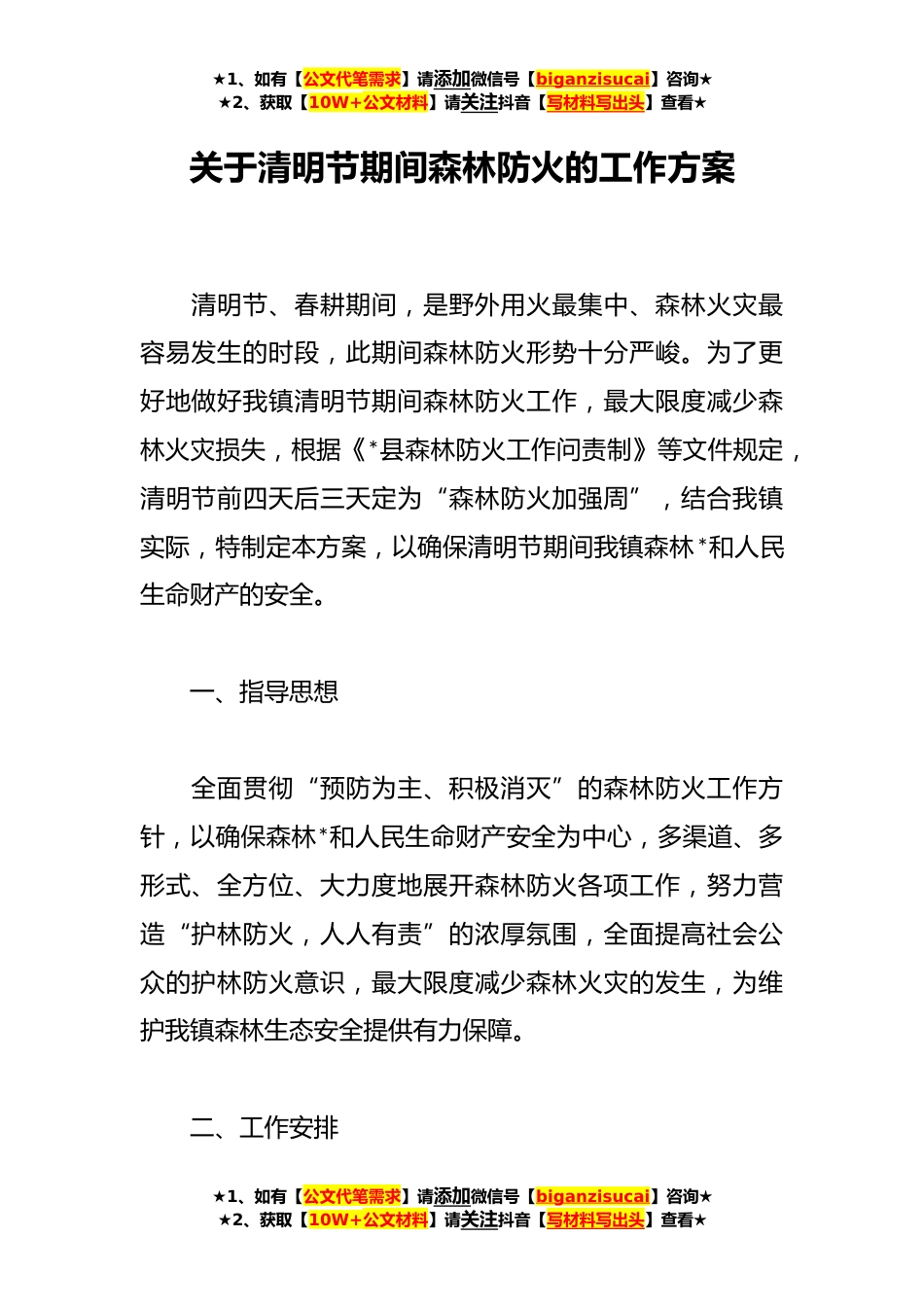 ★1、如有【公文代笔需求】请添加微信号【biganzisucai】咨询★★2、获取【10W+公文材料】请关注抖音【写材料写出头】查看★关于清明节期间森林防火的工作方案清明节、春耕期间,是野外用火最集中、森林火灾最容易发生的时段,此期间森林防火形势十分严峻。为了更好地做好我镇清明节期间森林防火工作,最大限度减少森林火灾损失,根据《*县森林防火工作问责制》等文件规定,清明节前四天后三天定为“森林防火加强周”,结合我镇实际,特制定本方案,以确保清明节期间我镇森林*和人民生命财产的安全。一、指导思想全面贯彻“预防为主、积极消灭”的森林防火工作方针,以确保森林*和人民生命财产安全为中心,多渠道、多形式、全方位、大力度地展开森林防火各项工作,努力营造“护林防火,人人有责”的浓厚氛围,全面...