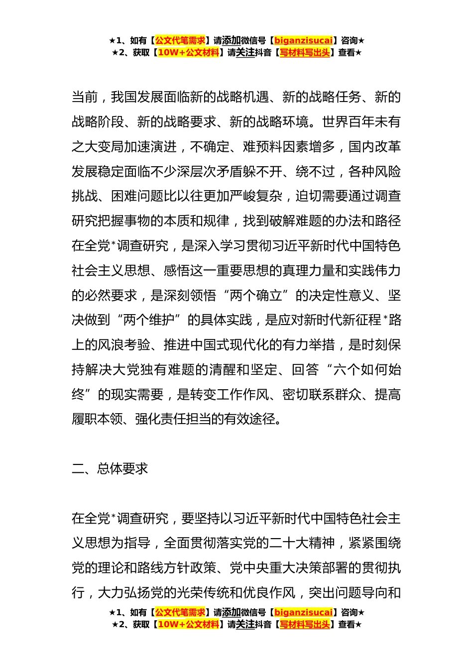 ★1、如有【公文代笔需求】请添加微信号【biganzisucai】咨询★★2、获取【10W+公文材料】请关注抖音【写材料写出头】查看★关于在全党*调查研究的工作方案为深入学习贯彻习近平新时代中国特色社会主义思想,全面贯彻落实党的二十大精神,党中央决定,在全党*调查研究,作为在全党开展的主题教育的重要内容,推动全面建设社会主义现代化国家开好局起好步。现制定如下工作方案。一、重要意义调查研究是我们党的传家宝。党的十八大以来,以习近平同志为核心的党中央高度重视调查研究工作,习近平总书记强调指出,调查研究是谋事之基、成事之道,没有调查就没有发言权,没有调查就没有决策权;正确的决策离不开调查研究,正确的贯彻落实同样也离不开调查研究;调查研究是获得真知灼见的源头活水,是做好工作的基本功...