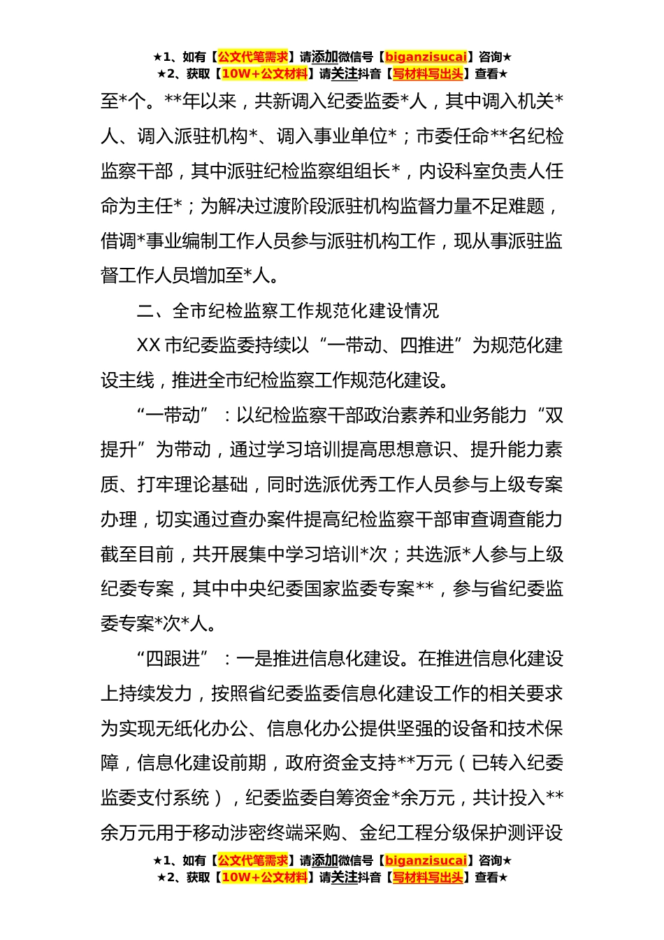 ★1、如有【公文代笔需求】请添加微信号【biganzisucai】咨询★★2、获取【10W+公文材料】请关注抖音【写材料写出头】查看★市纪委书记迎接省纪委监委调研汇报提纲(**)尊敬的XX及省纪委监委各位领导:欢迎莅临XX市调研指导工作。下面,我将XX市纪委监委截至目前各项工作开展情况汇报如下。一、基本情况XX市纪委监委机关内设机构*个;下属事业单位*;设立派驻纪检监察组*个;巡察办*;巡察组*;县(区)纪委监委*。(一)编制总体情况:全市纪检监察(含巡察机构)编制总数**,其中机关行政编制**、下属事业单位编制*个、派驻机构行政编制*个、巡察办行政编制*个、巡察组行政编制*个。(二)办公整体环境:纪委监委有一体化办公楼*(面积***方米),其中有办公室*、涉密视频会议室*、小会议室*、党员之家功能室*...
