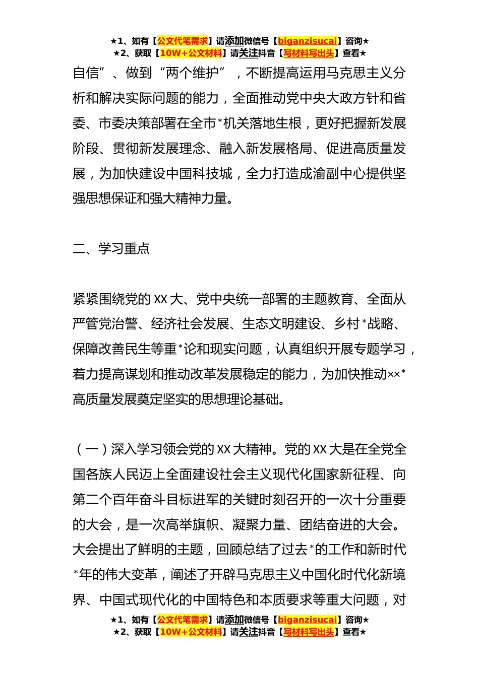 ★1、如有【公文代笔需求】请添加微信号【biganzisucai】咨询★★2、获取【10W+公文材料】请关注抖音【写材料写出头】查看★**年XX市局党委理论学习中心组学习计划方案**年是全面贯彻落实党的XX大精神的开局之年。按照市委《**年全市党委(党组)理论学习中心组学习安排意见》要求,结合全市*工作和队*设实际,就**年度市局党委理论学习中心组学习制定如下方案。一、总体要求坚持不懈学习马克思列宁主义、毛泽东思想和中国特色社会主义理论体系,切实把学习贯彻党的XX大精神、习近平新时代中国特色社会主义思想和习近平总书记对政法*工作系列重要指示精神作为学习的首要任务,坚持读原著、学原文、悟原理,切实提升“学懂弄通做实”的觉悟和本领坚持常学常新、学思践悟、细照笃行,深刻领悟“两个确立”的决定性意...