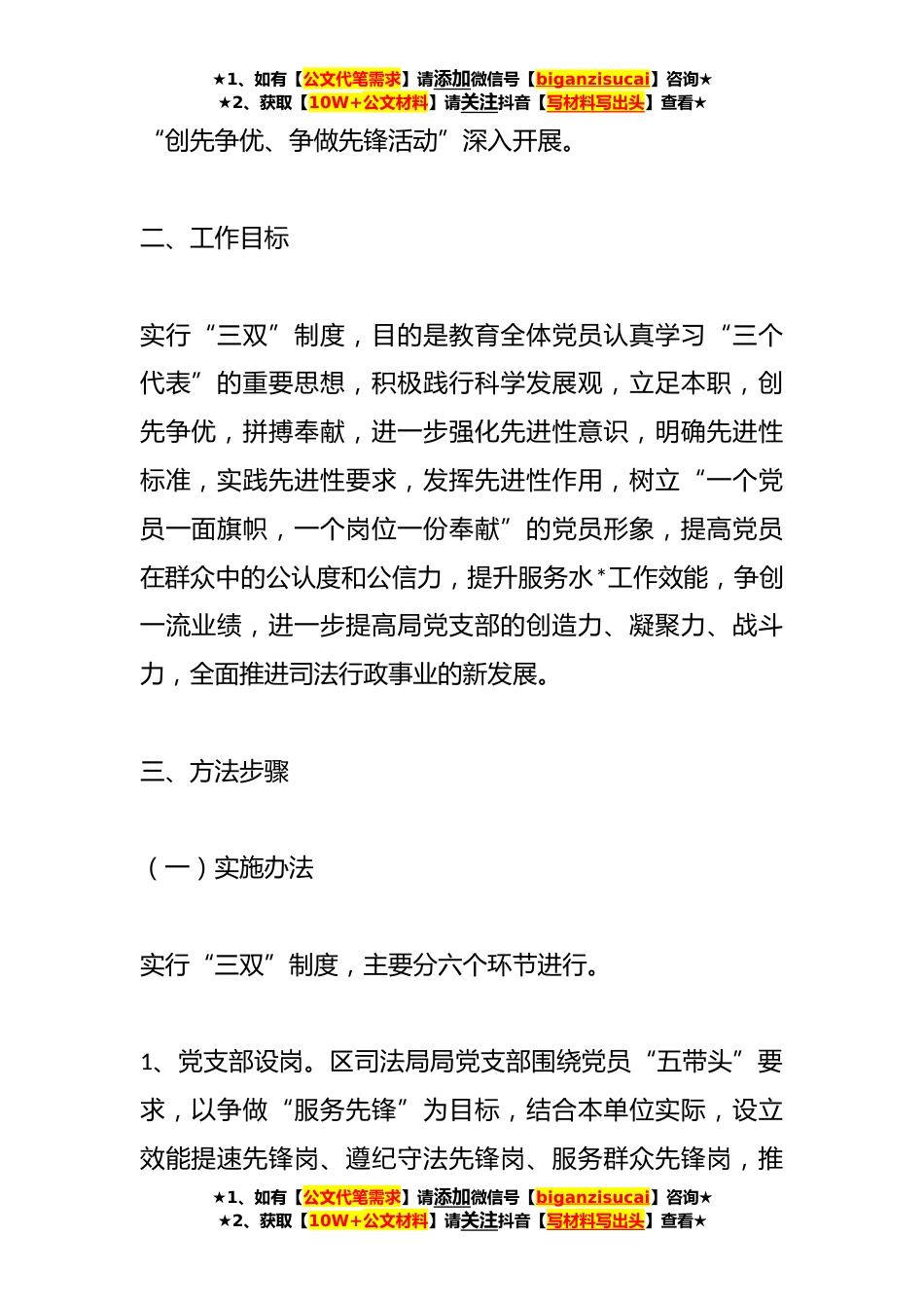 ★1、如有【公文代笔需求】请添加微信号【biganzisucai】咨询★★2、获取【10W+公文材料】请关注抖音【写材料写出头】查看★党员双诺双述双评实施方案为深化创先争优争做先锋活动,按照济创先发[*XX]*文件要求,结合全区司法行政工作实际,在局机关全体党员中实行以党员向局党支部和党员群众承诺、述诺、对践诺情况由局党支部考评和党员群众评议为主要内容的“双诺、双述、双评”制度(以下简称“三双”制度),特制定本实施方案:一、指导思想实行“三双”制度,要坚持以邓小平理论和“三个代表”重要思想为指导,牢固树立和落实科学发展观,深入贯彻落实区委关于开展创先争优活动的部署要求,紧紧围绕全区和谐稳定大局,立足党员岗位实际和职业特点,通过细化党员发挥先锋作用的具体要求,基层党组织设岗、党员...