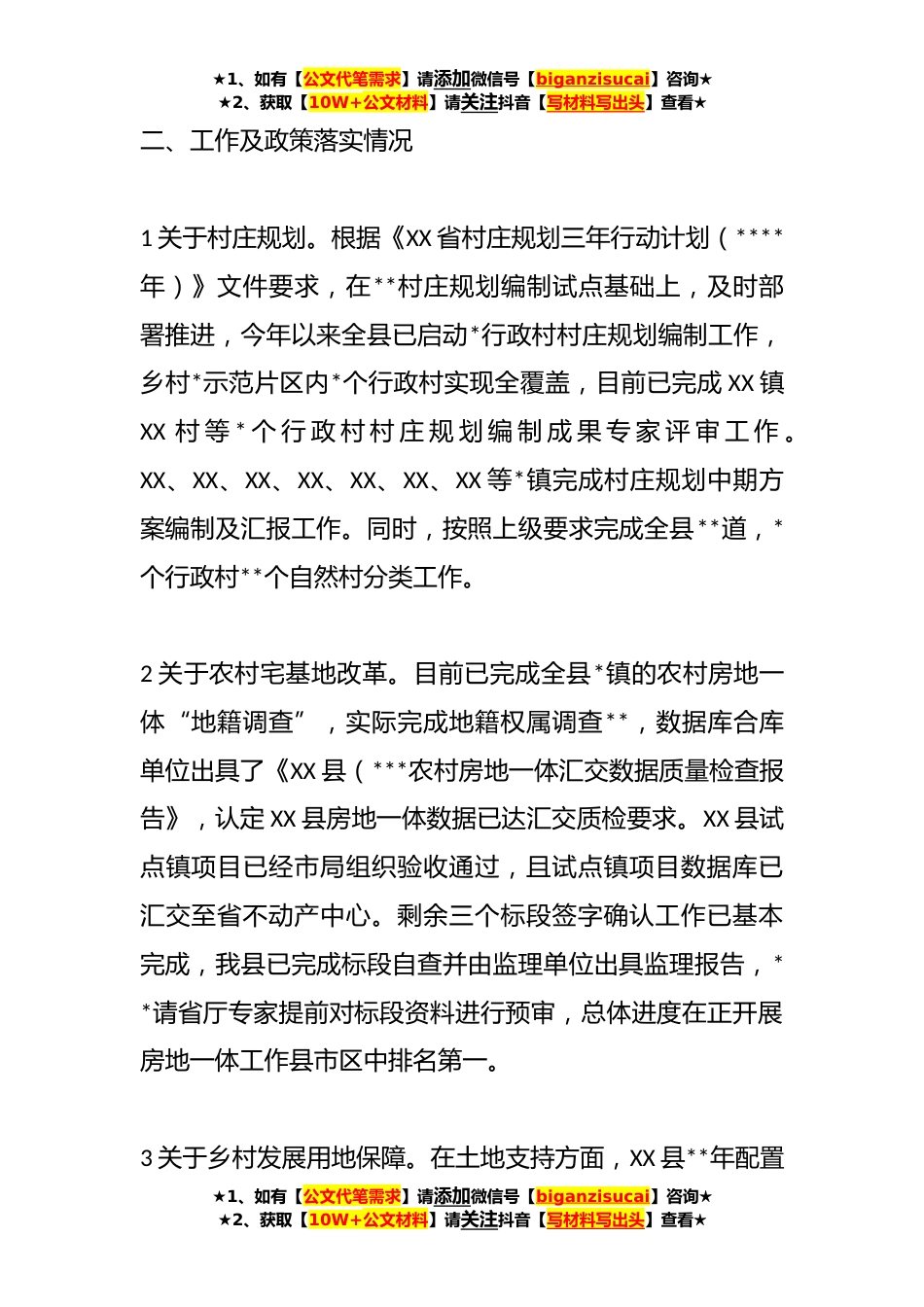 ★1、如有【公文代笔需求】请添加微信号【biganzisucai】咨询★★2、获取【10W+公文材料】请关注抖音【写材料写出头】查看★**年度某县自然*和规划局乡村*工作年度总结今年以来,我局围绕县委、县政府关于乡村*工作相关要求,从政策落实、责任落实和工作落实等方面,扎实推进我局脱贫攻坚相关工作。对照**年目标任务和考核指标,认真开展自检自查工作,现将相关情况报告如下。一、责任落实情况成立实施乡村*战略工作专班,制定实施方案,确保乡村*工作落到实处。主要领导按照工作要求认真履行职责,当好表率,积极带头学习贯彻落实习近平总书记关于“三农”重要论述、巩固拓展脱贫攻坚成果同乡村*有效衔接和考察XX重要讲话指示精神。按时听取工作情况汇报,及时召开巩固拓展脱贫攻坚成果同乡村*有效衔接工作会议,...