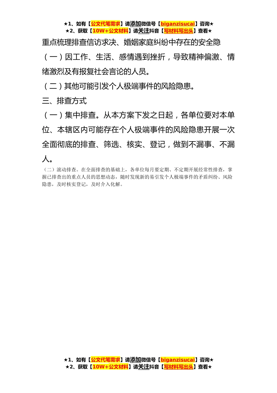 ★1、如有【公文代笔需求】请添加微信号【biganzisucai】咨询★★2、获取【10W+公文材料】请关注抖音【写材料写出头】查看★XX局开展排查防范个人极端事件风险隐患专项行动实施方案为贯彻落实省、XX市电视电话会议精神,根据市委政法委《关于印发<开展排查防范个人极端事件风险隐患专项行动实施方案>的通知》(x政法[x、x号)要求,市妇联决定,在全市开展个人极端事件风险隐患排查防范专项行动,利用一年时间,全面排查防范个人极端事件风险隐患,消除不*因素,助力全市社会和谐稳定。一、总体要求以维护社会安全稳定为原则,以不发生危害社会公共安全的个人极端事件为目标,全面排查有暴力倾向、扬言报复社会、性格偏执思想极端的群体、人员和可能引发暴力冲突的行为。坚持从抓早抓小入手,因地制宜、因事制亘,...